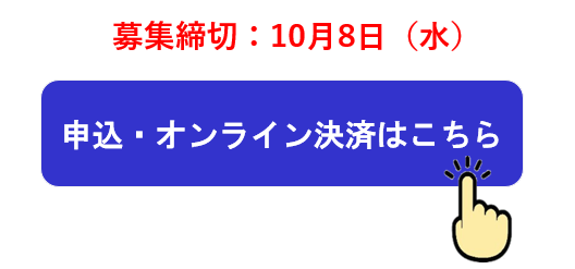 こちらから「申込・決済」へお進みいただくことができます。 オンライン申込・決済となりますので、クレジット決済をご希望の方はお手元にクレジットカードをご準備のうえ、お申込ください。 ※コンビニ決済[現金払い]可能。