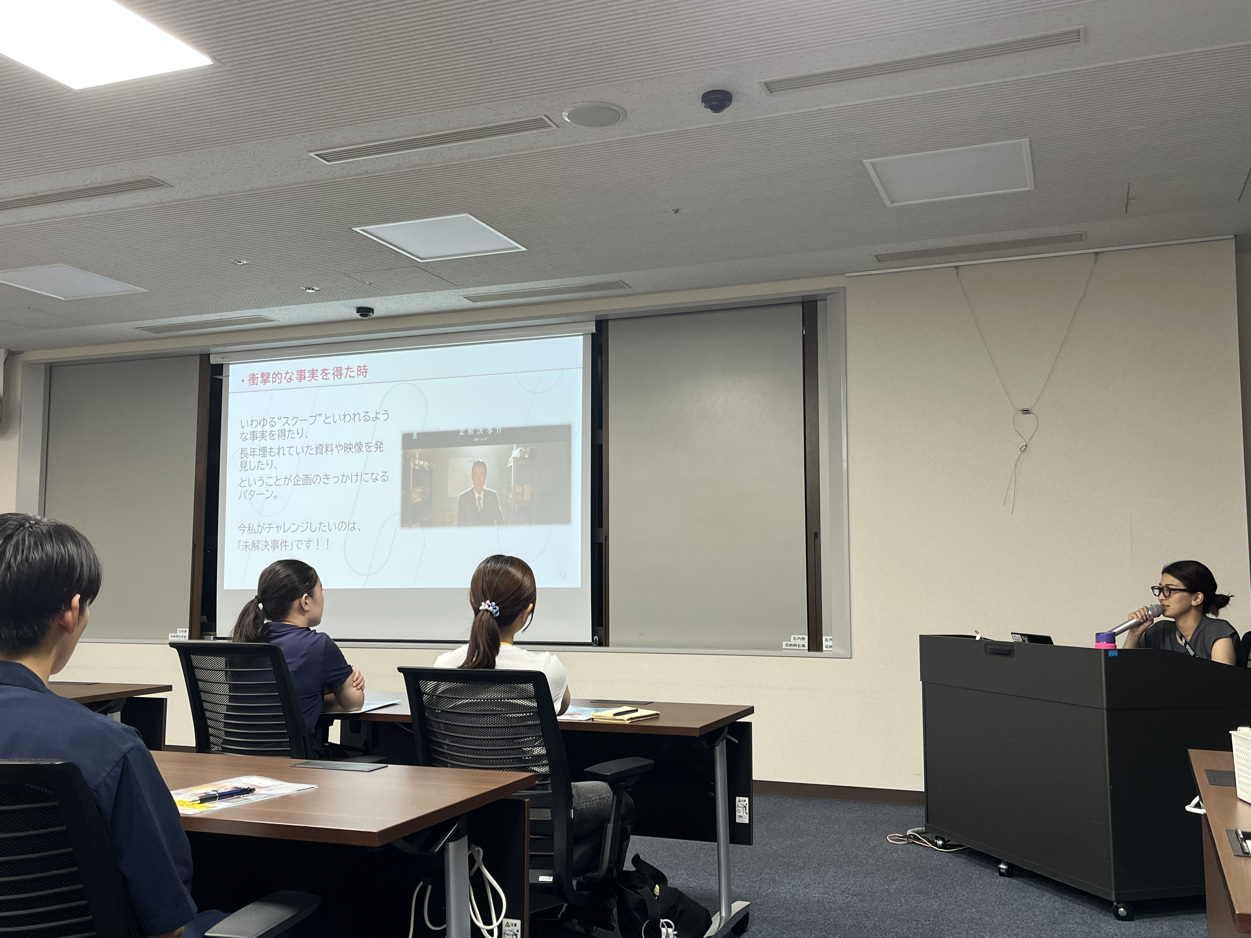 最後に、入局4年目の報道番組のディレクターが制作した番組の視聴と講話がありました。ディレクターからは、「ディレクターの仕事は難しいけど面白い。提案次第で誰にでもチャンスがあり、人との出会いが財産になる。普通では会うことのできない人と関わることは新鮮だし、自分自身をアップデートできる。人にも優しくなれる」と仕事のやりがいについて学生に語ってくれました。また、参加者からの「学生時代に取り組んだ方がいいことは何か?」という質問に対しては、「学生時代は、自分が好きなこと、それを実現するためにどうしたらいいのか、考えることが大事です。”好き”がいつか仕事にも繋がると思います」とアドバイスがありました。