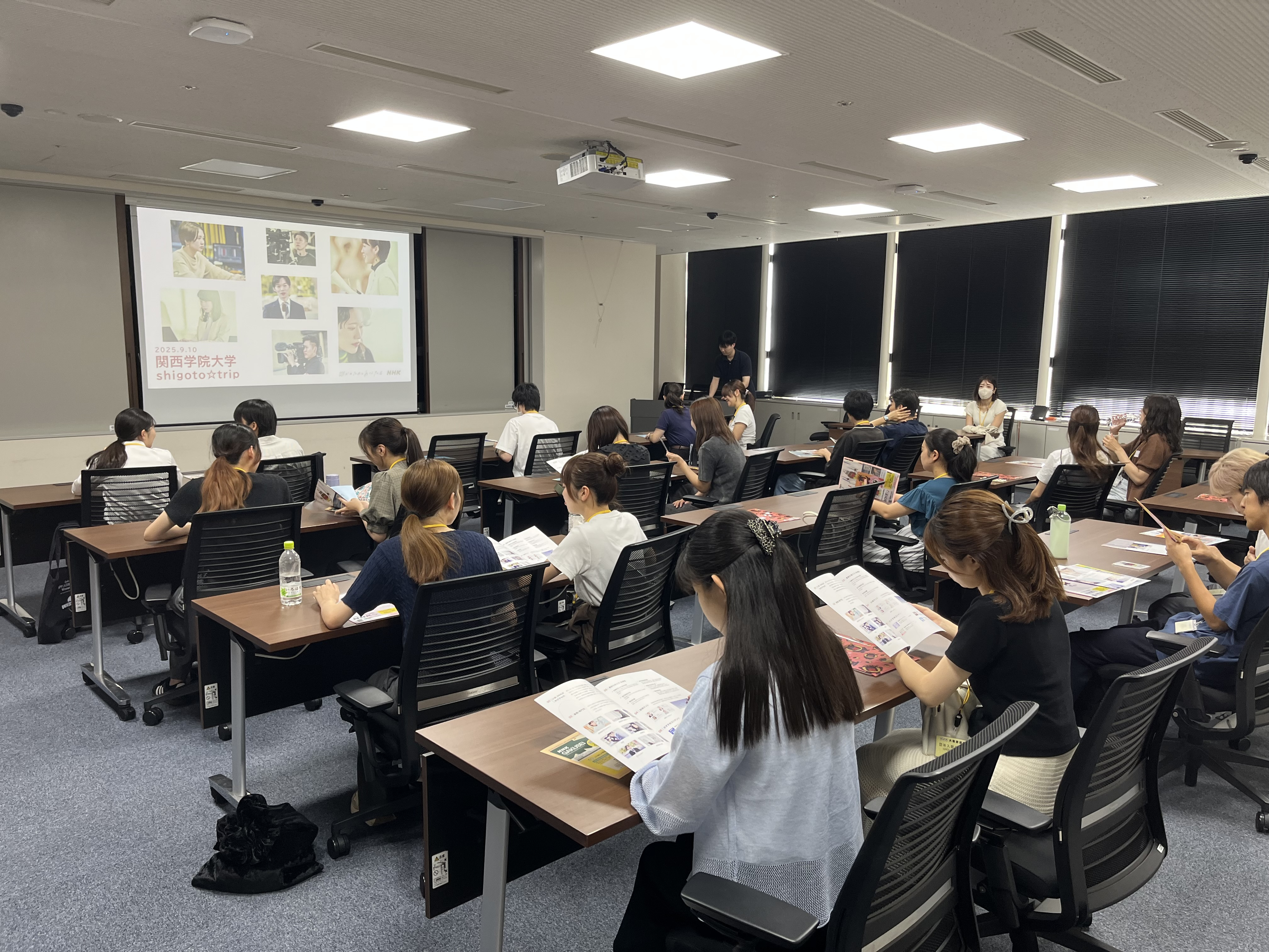 shigoto☆tripは、本学キャリアセンターと企業がコラボして行う、業界・企業・仕事研究に関する職場見学型プログラムです。学生が企業のオフィスや製造現場を実際に訪問・見学し、働く社員との交流を通じて自らの将来について考えることをねらいとしています。