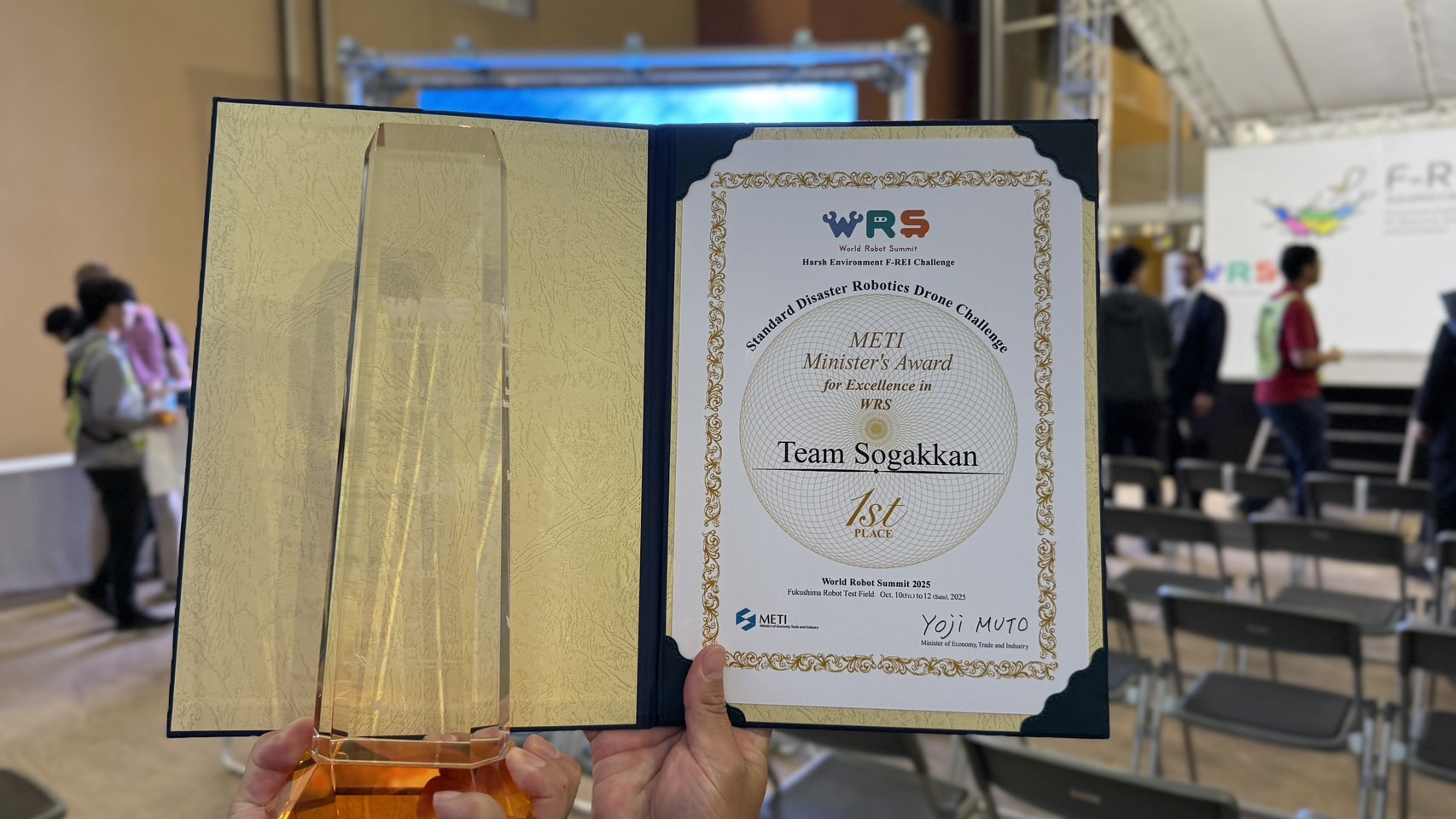 総合政策学部の山田孝子教授、大用庫智准教授と株式会社那須管財ドローン事業部(操学舘ドローンスクール)との共同研究チーム「Team Sogakkan」が、World Robot Summit 2025の過酷環境F-REIチャレンジ『標準性能評価ドローンチャレンジ』で優勝し、経済産業大臣賞を受賞しました。