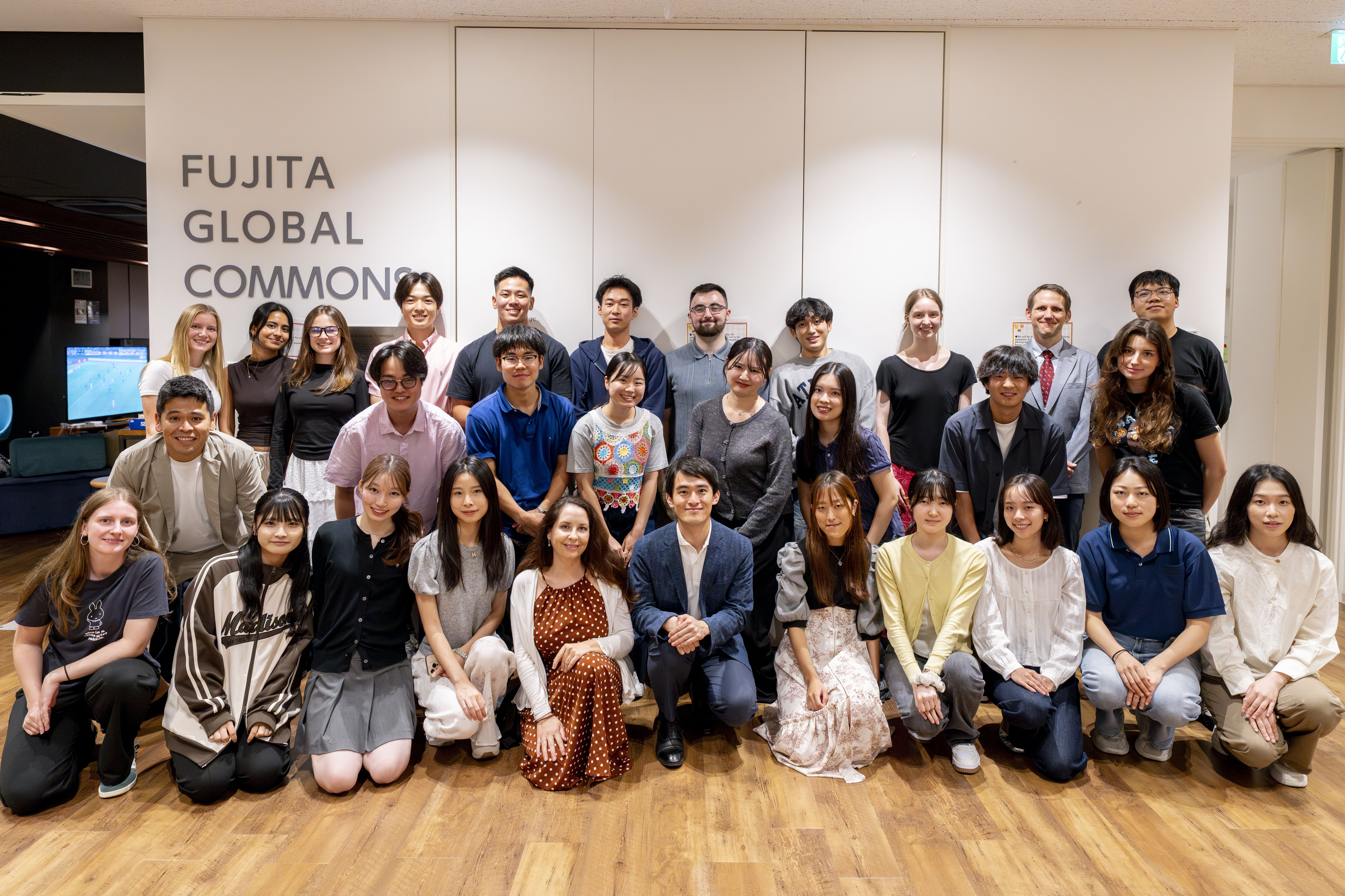 講演会終了後は、関西学院大学の国際教育寮である有光寮に移動して座談会を実施しました。国際寮で留学生と生活を共にしながらサポートや交流促進を行うレジデンス・アシスタント(RA)と、寮で暮らす留学生、約25名が参加し、和やかな雰囲気の中で英語による交流が行われました。