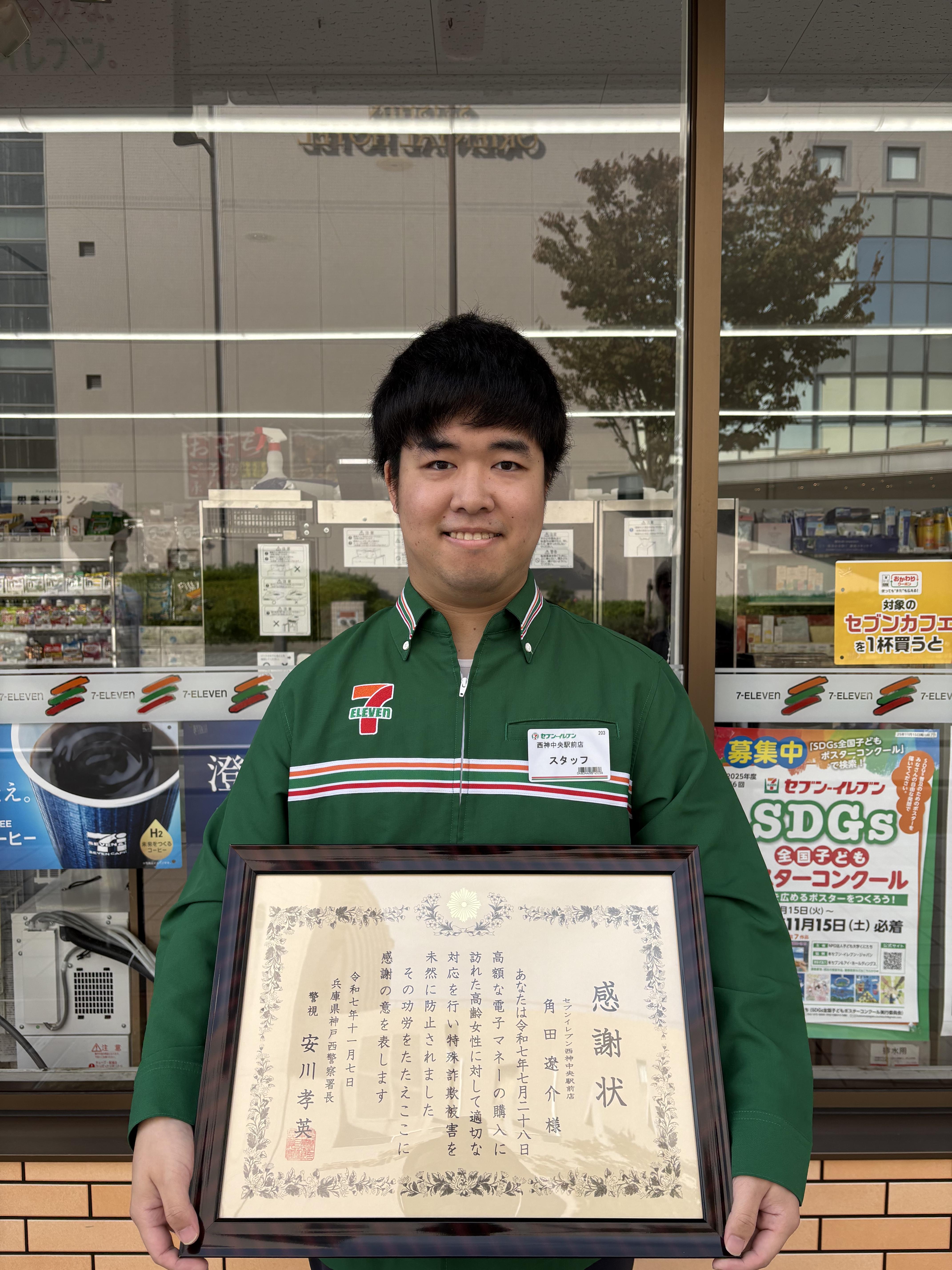 角田さんは、2025年7月に、アルバイト先のコンビニエンスストアで、特殊詐欺の被害を未然に防ぎました。女性が高額なプリペイドカードをレジに持ってきた際に、金額を不審に思って利用用途などを聞いて詐欺だと見抜き、警察に通報したということです。