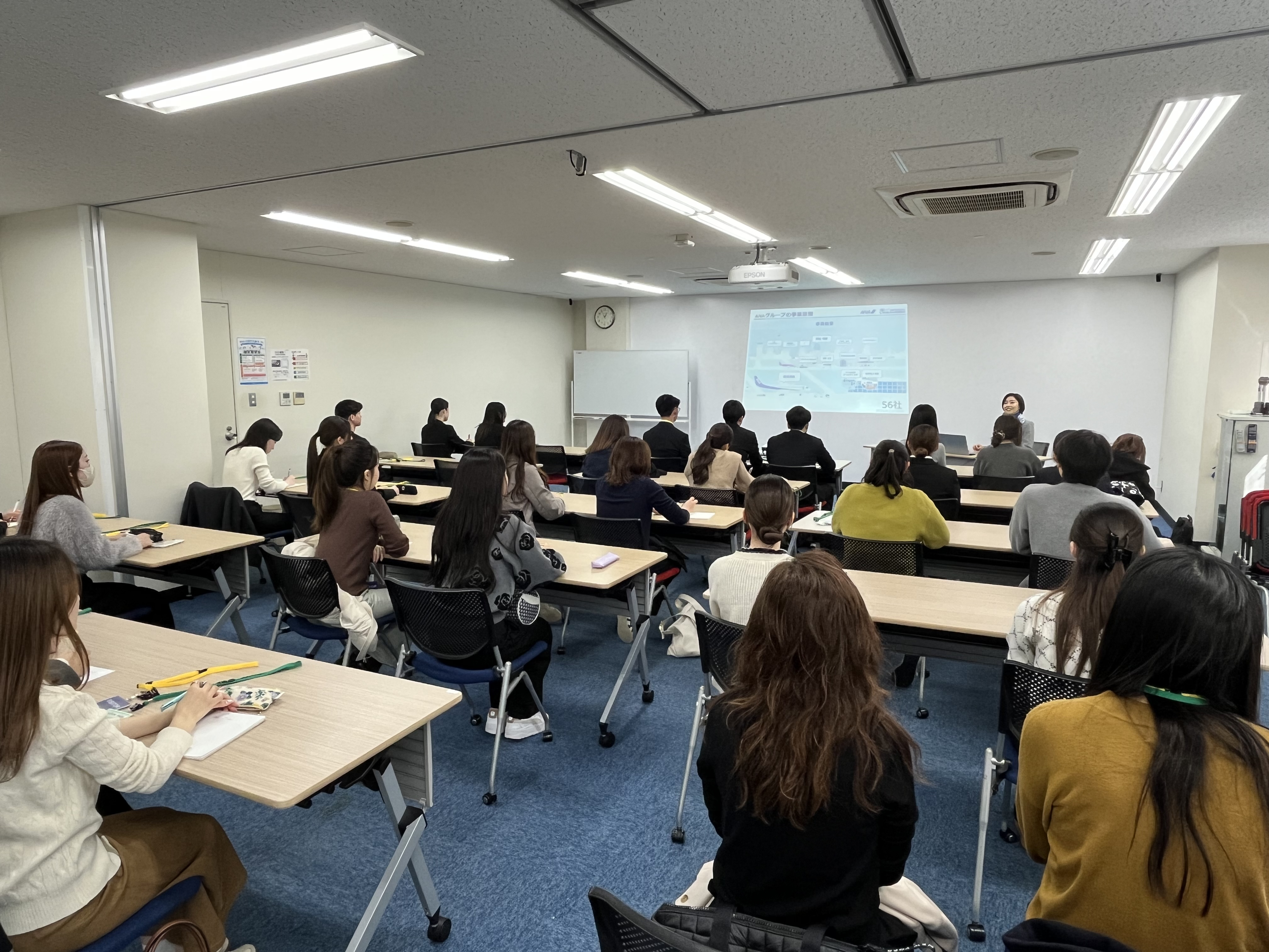 はじめに学生たちは、会議室でANAグループの採用担当者から、ANAグループの歴史や主な事業、組織構成、幅広い職種について説明を受けました。担当者からは、ANAグループの経営ビジョンである『ワクワクで満たされる世界を 私たちは空からはじまる多様なつながりを創り、社員・お客様・社会の可能性を広げていきます』をはじめ、客室部門や空港運営会社のみならず、商社、旅行、IT事業など、航空運送事業とは直接的な接点の少ない多様な事業内容について話がありました。