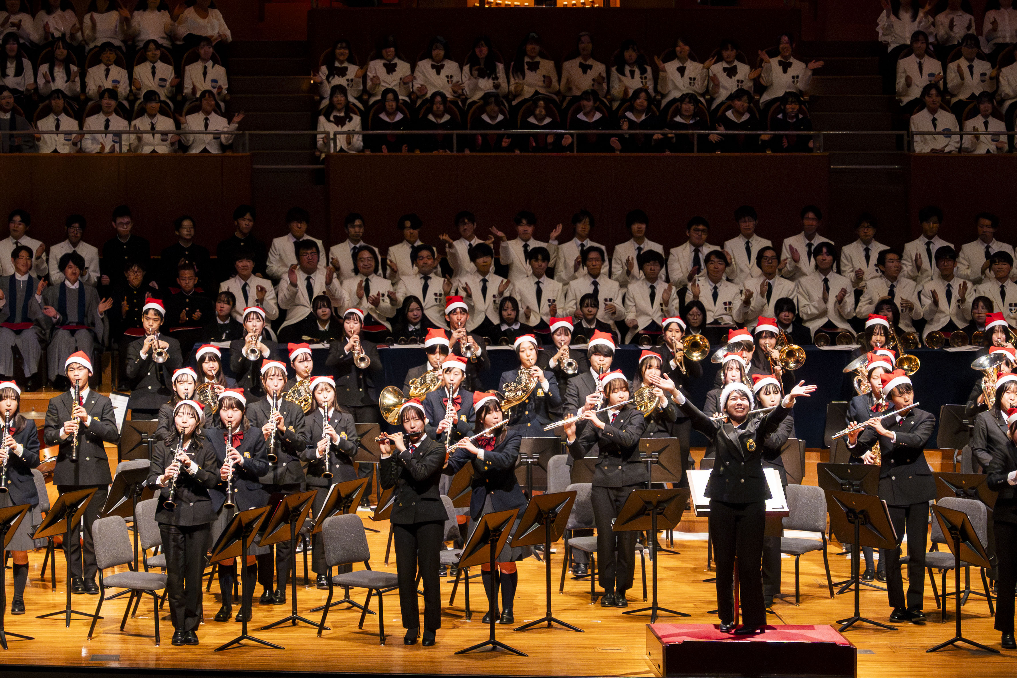 クリスマスコンサートが行われた第二部では、オルガニストによるパイプオルガンの演奏に始まり、交響楽団がヘンデルのメサイヤから「For unto us a Child is born」を奏でました。続いて、ハンドベルの繊細な音色が響き、グリークラブが力強い歌声で会場を魅了しました。最後に、吹奏楽部が「ジングルベル」などのアップテンポなクリスマスソングが会場を盛り上げ、観客からは大きな拍手が送られました。
