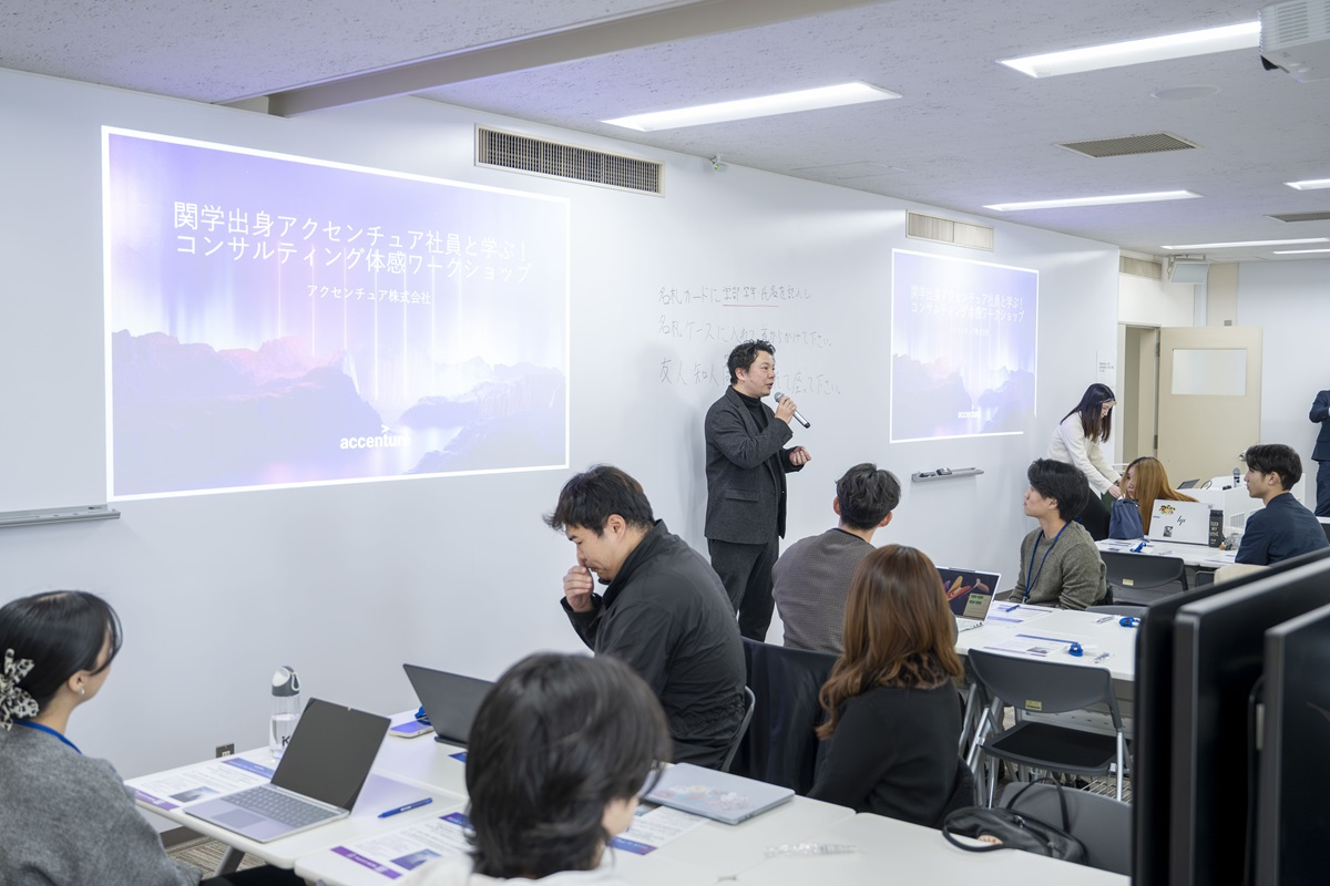 アクセンチュアとキャリアセンターは、今年度6社目となる「BiZCLASS」を2025年12月16日に西宮上ケ原キャンパスで開催しました。ストラテジー、コンサルティング、テクノロジー、オペレーションズ、ソング、インダストリーXの領域で幅広いサービスを提供している世界最大級の総合コンサルティング企業について学ぶプログラムを実施しました。