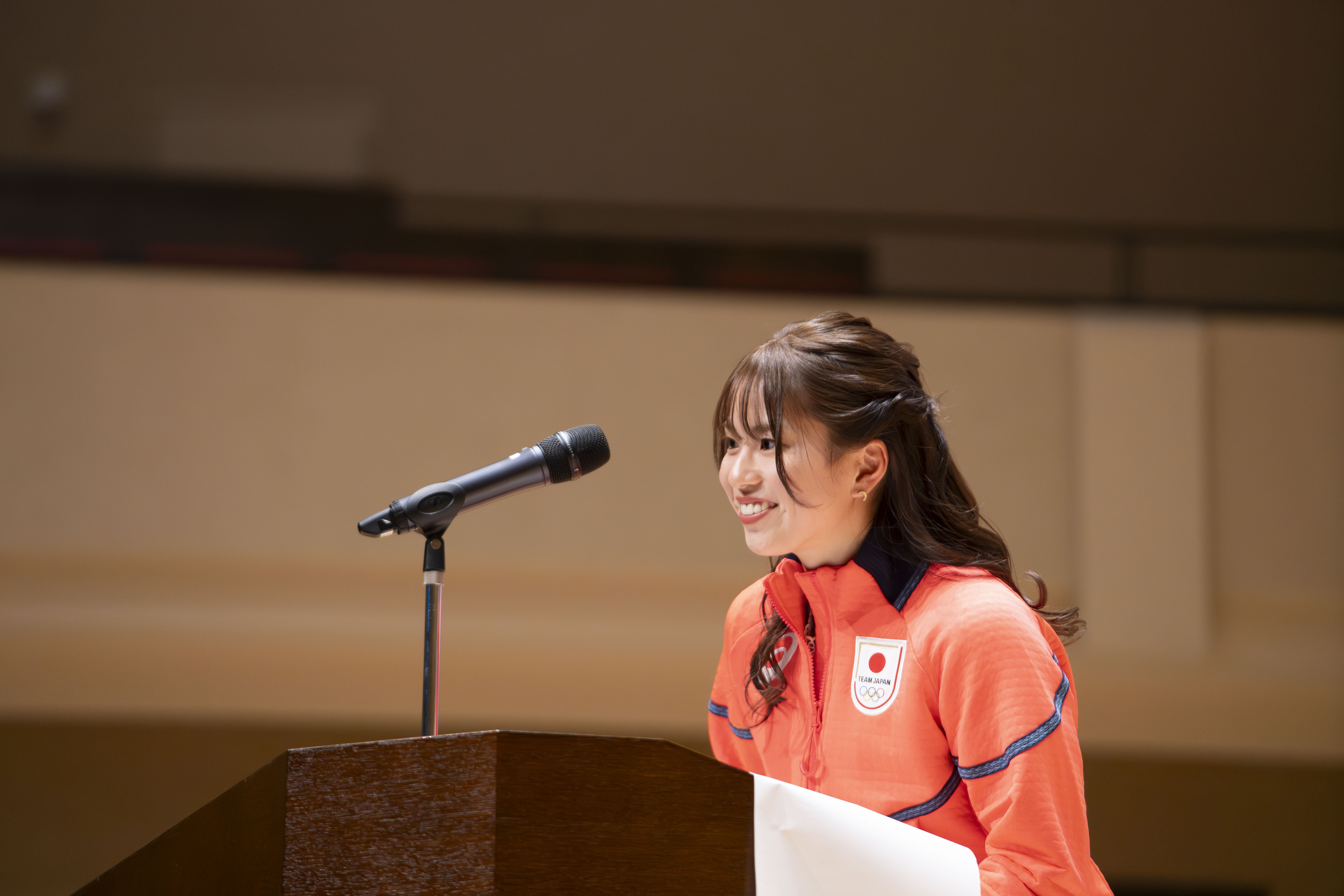 最後に、日本代表の公式ウェアを着た長森さんが挨拶を行い、関西学院での4年間について、「関学は文武両道の学校なので、スケート部とゴルフ部で結果を残せたことだけでなく、小学校の教員免許や図書館司書の資格を取ることが出来て、良い思い出がたくさんあります」と振り返っていました。そして、オリンピックを目指したきっかけについて、「子どものころに、関学卒業生の横山さんが平昌オリンピックに出場した際の壮行会に参加したことで、自分にとって現実的な目標となった。関学にも横山さんを追いかけて入学しました」とした上で、「次は、自分が子どもたちに夢を与えられるような存在になれるよう、全力で滑りきります」と決意を述べました。