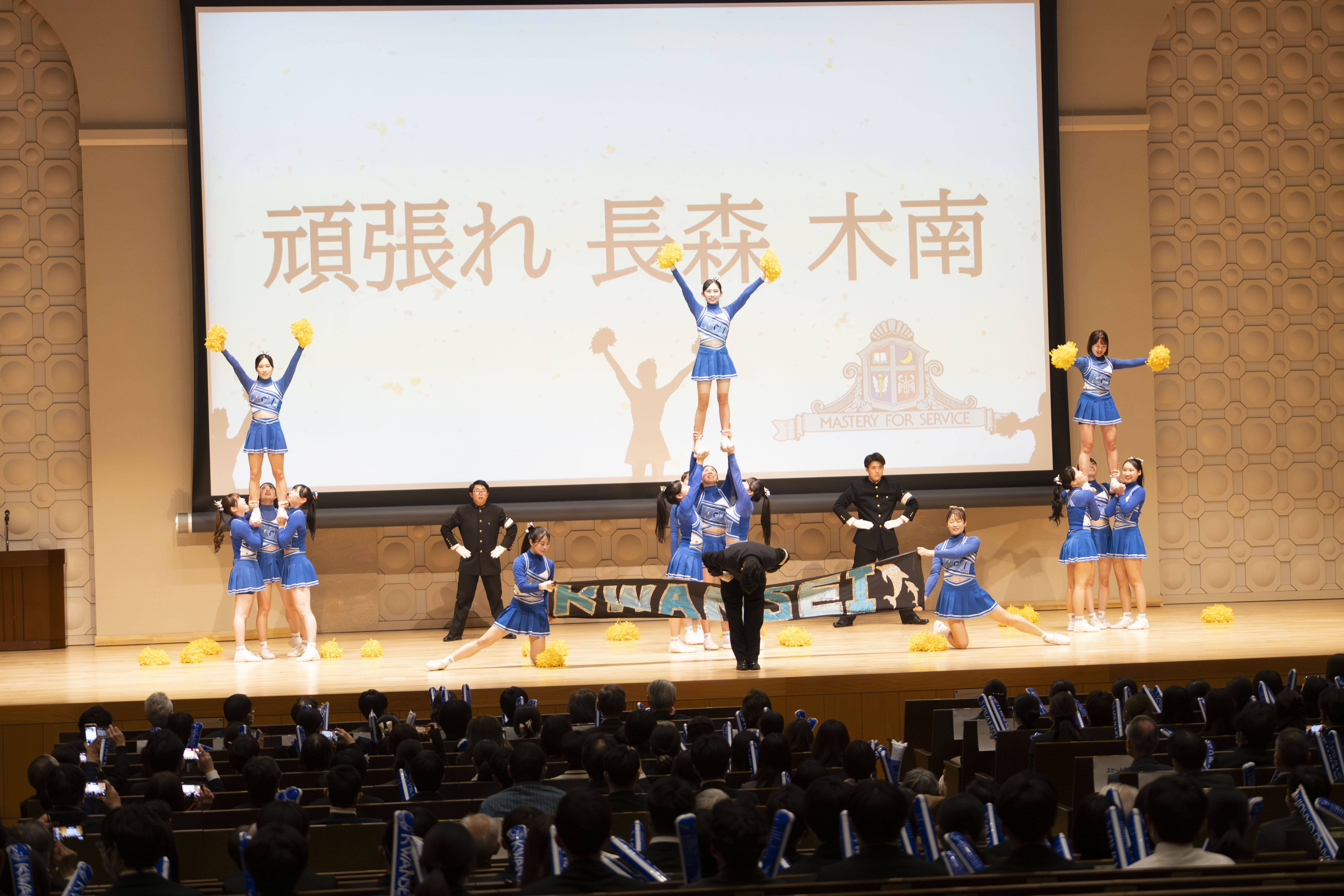 続いて、現役のスケート部員4名から長森さんに花束と激励のメッセージが書かれた国旗が贈られた後、応援団総部が長森さんと木南さんに送る演舞を披露し、会場を盛り上げました。