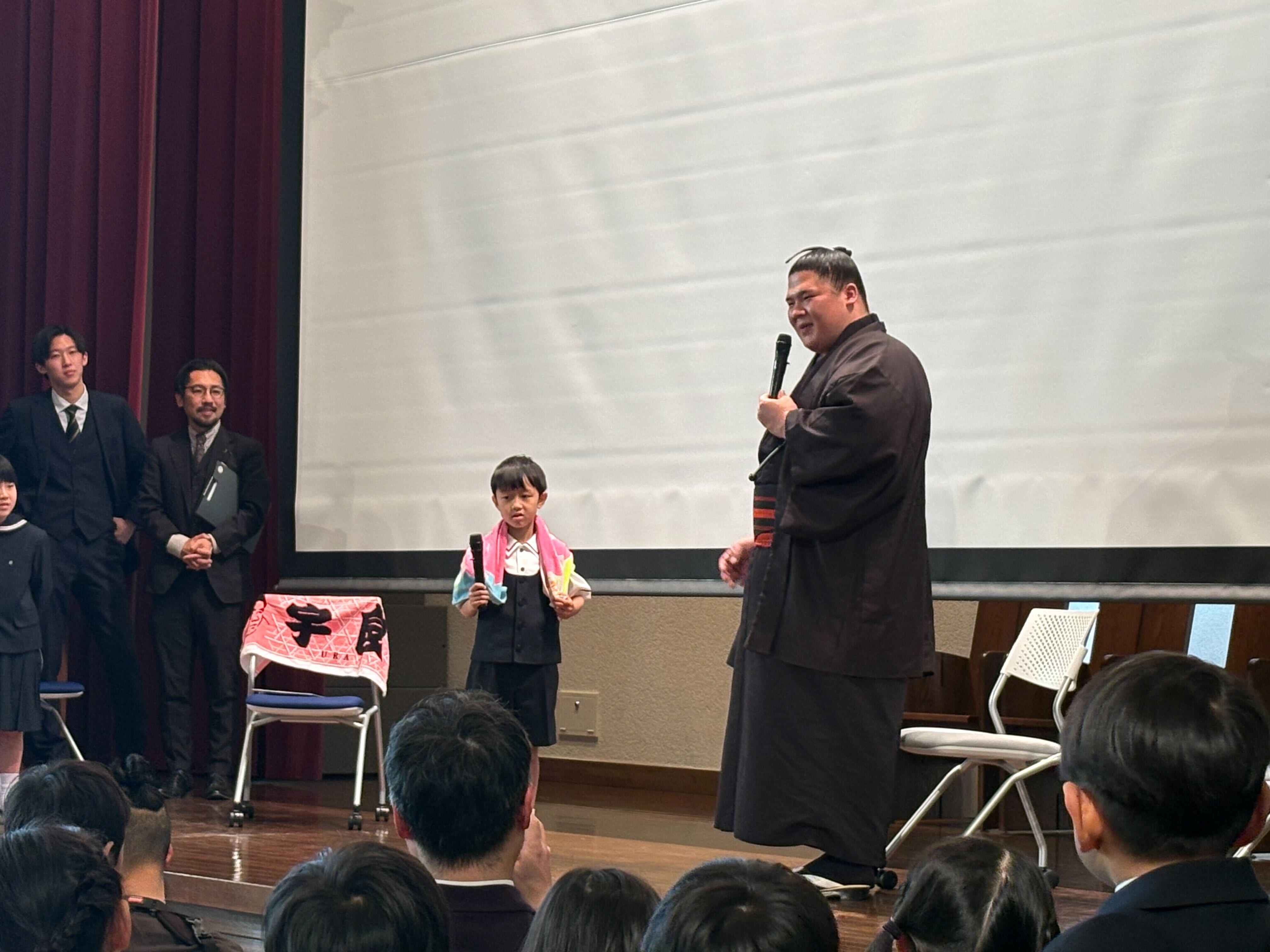 宇良関は関西学院大学体育会相撲部出身で2015年3月に教育学部を卒業した後、角界入りし、今回は御当所として臨む三月場所(大阪)にあわせて、初めて関西学院初等部を訪れました。