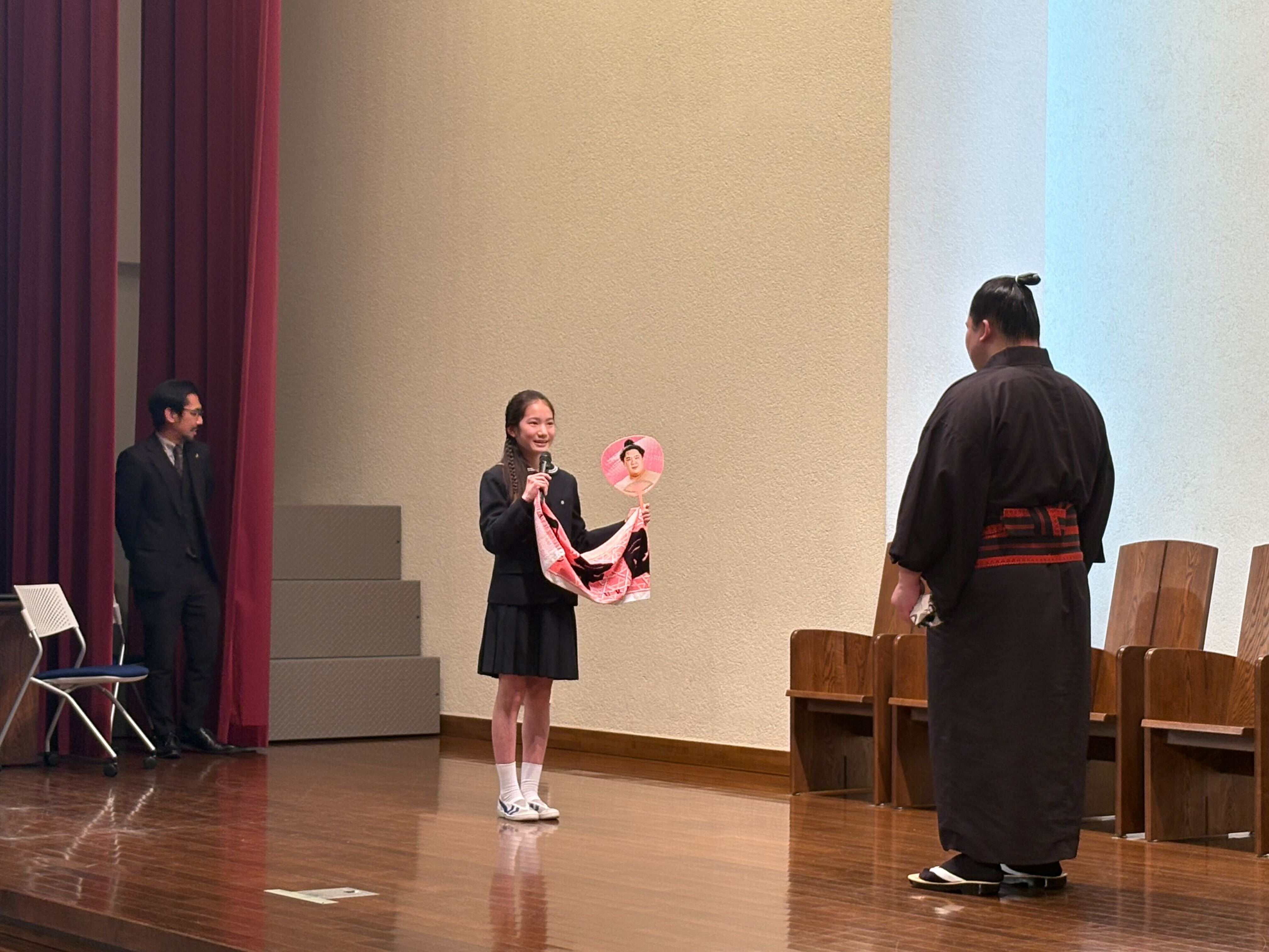 宇良関のタオルとうちわを持って参加した6年生の有本眞麻さんは「両親の影響で赤ちゃんの頃から相撲を見ていて、幼稚園の頃からの宇良関のファンです。関学のスーパースターである宇良関が自分の学校に来てくれたのは、本当に嬉しいですし、びっくりしました」と喜びの気持ちを話していました。