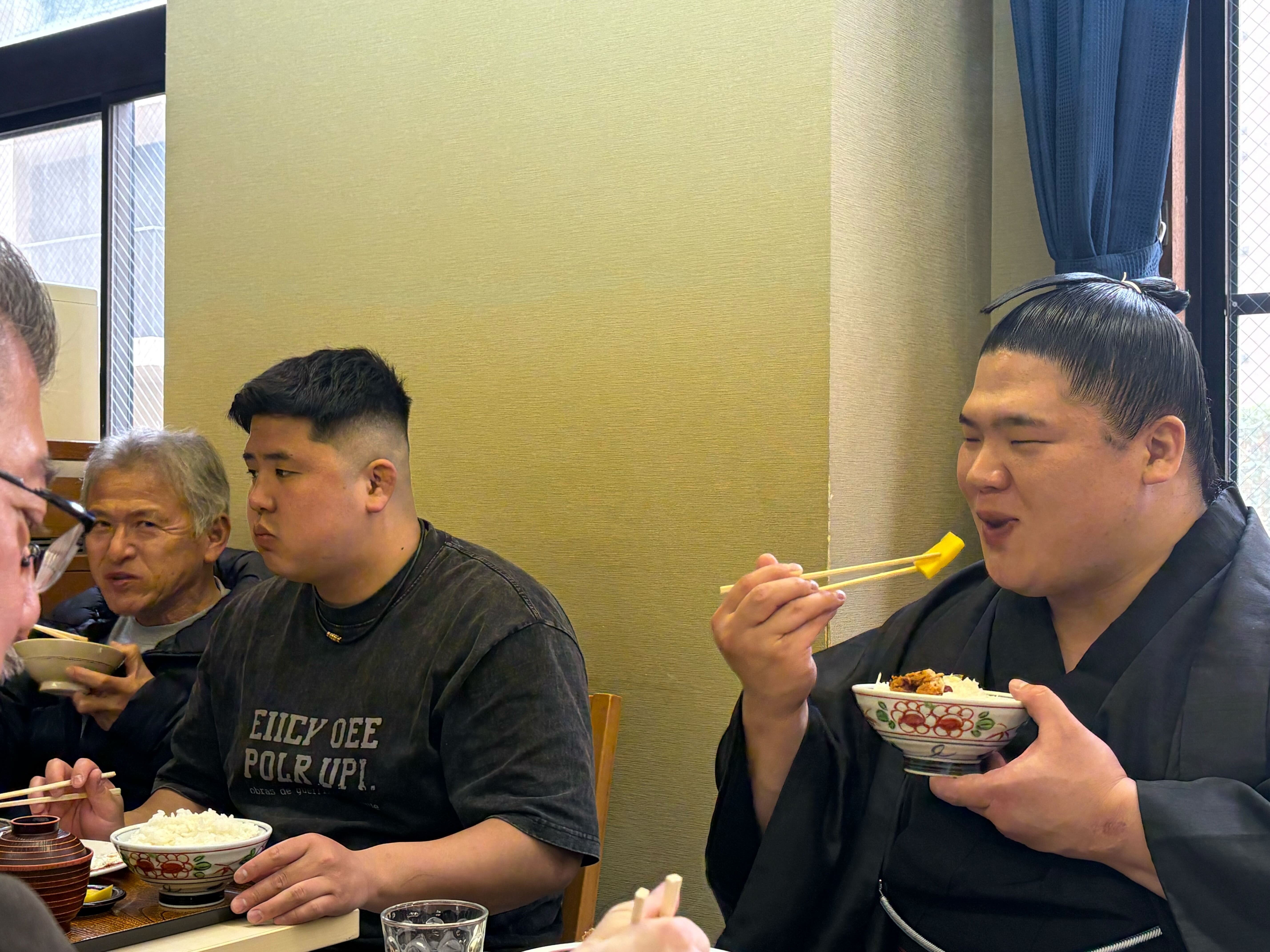 一緒に食事をした人間福祉学部の3年生で相撲主将の梶浦傘太さんは、「忙しい中、場所前にはいつも相撲部に来てくださったり、稽古をつけてくださったり、本当にありがたいです。三月場所も頑張って欲しいです」と話していました。