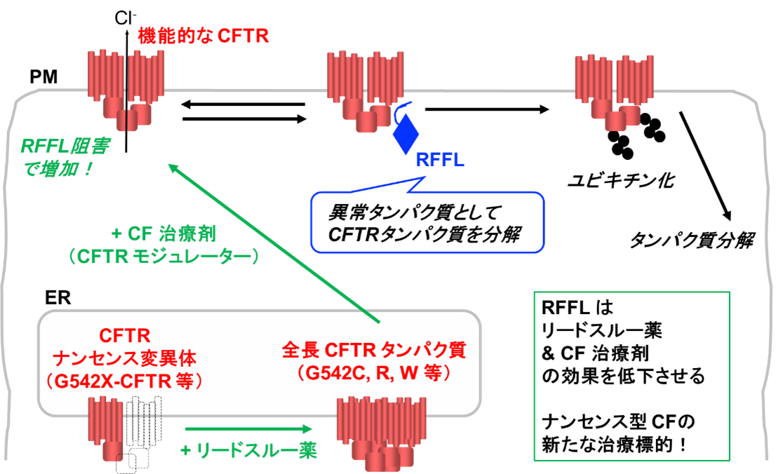 嚢胞性線維症のナンセンス変異*2ではCFTR*3タンパク質の産生が途中で中止されます。翻訳リードスルー誘導薬(TRID)*4によってCFTRタンパク質の産生を回復させても、細胞内のタンパク質品質管理機構により分解されるため治療効果が失われます。本研究では、ユビキチンリガーゼ*5RFFLがTRIDにより回復したCFTRタンパク質を分解する主要因であることを明らかにし、RFFLを抑制することでCFTRタンパク質の機能回復が大きく向上することを示しました。