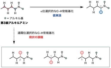 しかし従来の手法では、第3級アルキルアミンに対するC–H変換は、主に窒素に隣接するα位、もしくは鎖の末端に限られていました。また、窒素から離れた内部のC–H結合は、反応性や選択性の制御が難しく、狙って変換することが困難でした。