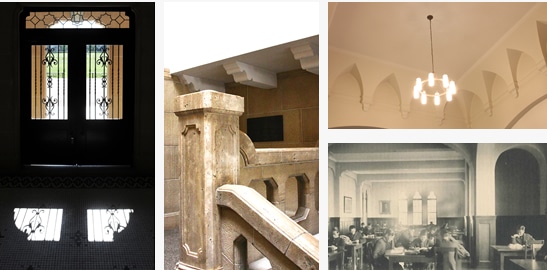 西宮上ケ原キャンパスの時計台は、1929年の移転に際して図書館として建てられました。W.M.ヴォーリズによるキャンパス構想の基点として大学全体を一望できる中心的存在に位置づけられています。建築様式はスパニッシュ・ミッション・スタイルを基調とし、各所には美しい意匠が施されています。時計台塔上部にはモザイクタイルの小ドームを据え、頂きに学院のシンボルマークの新月を冠したクロス、さらに建物に入ると1階ロビーには愛らしい模様のタイルが敷き詰められています。正面の階段を上ると吹き抜けの空間があらわれ、2階展示室(旧図書館閲覧室)には白塗りの高く美しい天井が広がります。ぜひ建物の細部にも着目してください。