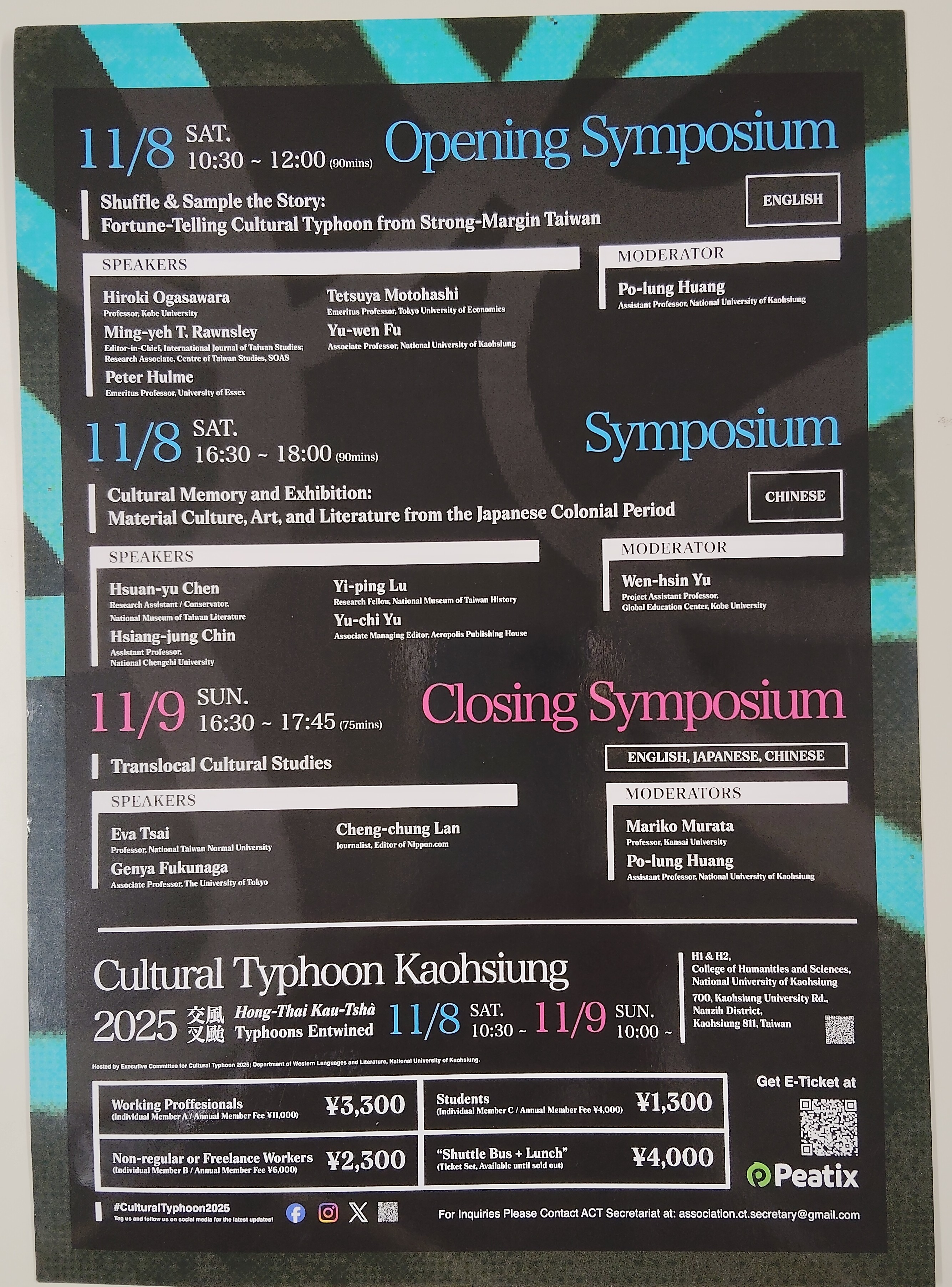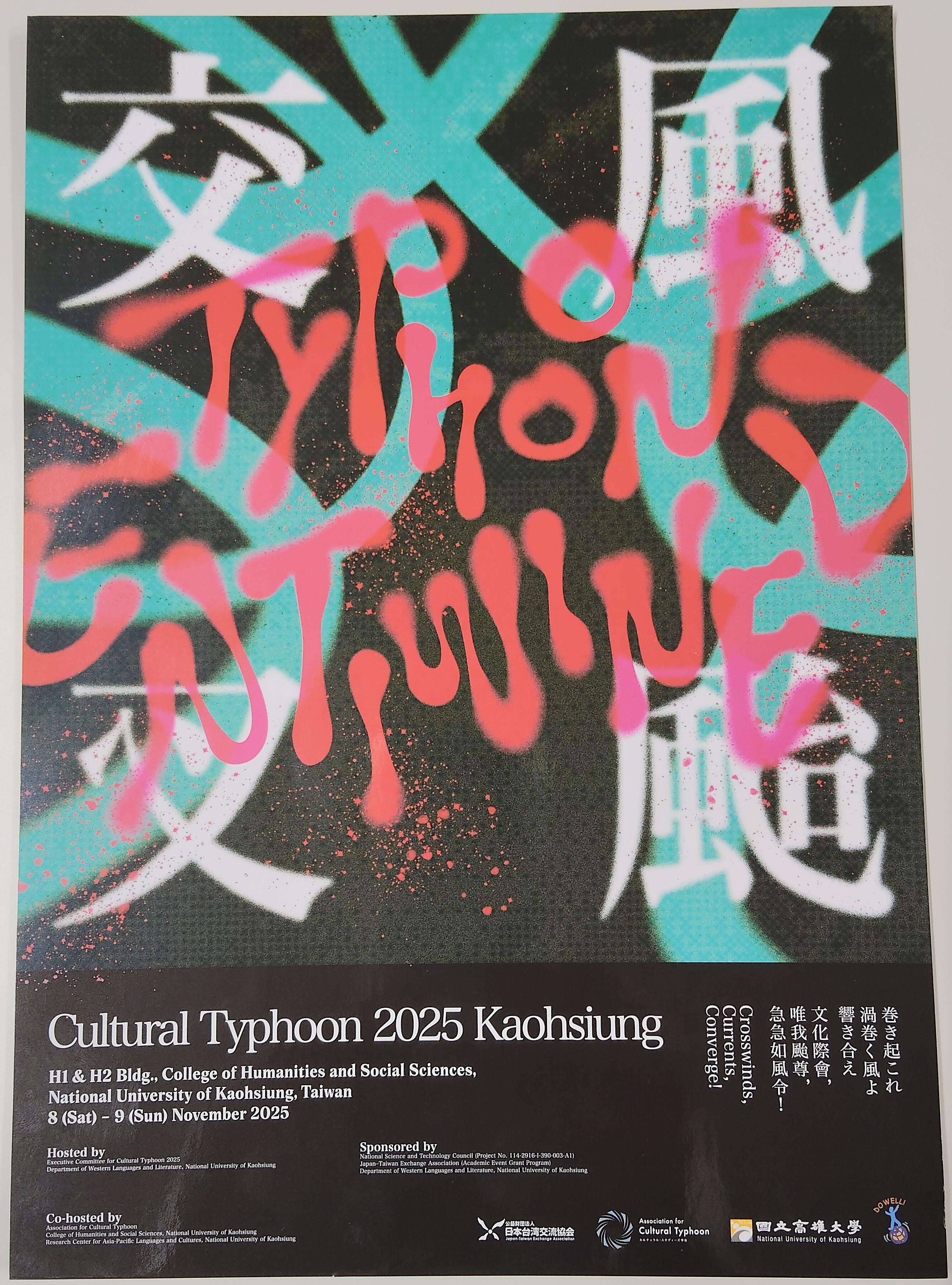 堀あきこ・社会学部助教が、2025年11月8日から9日にかけ、National University of Kaohsiung, Taiwanで開催されたCultural Typhoon 2025において、ライブハウスにおけるセーファースペース構築の試みをテーマに発表を行いました。Cultural Typhoon (文化台風)は、既存の学会やシンポジウムの形式や制度にとらわれず、さまざまな立場の人々がお互いにフラットな関係のもと発表や対話や表現活動をおこなうため、2003年より毎年、開催されています。本大会は複数の言語を用いる発表者が同じ場で交流する試みが行われ、多言語対話での活発な議論が行われました。