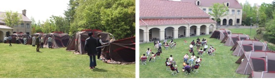 本研究では,関西学院大学と株式会社スノーピークが神戸三田キャンパス(KSC)で開催した日帰りキャンプ体験プログラム「1Day Camp」において調査を実施しました。調査は、好悪や良し悪しなどの評価に加え、「わくわくする」「癒やされる」「不安な」などの感情、「閉鎖的な―開放的な」や「軽い―重い」「つめたい―あたたかい」などの印象も尋ねるもので、キャンプ体験の前と後の2回実施しました。また、テントを自分たちで設営するグループと、既に設置されたテントを利用するグループで回答の傾向を比較しました。
