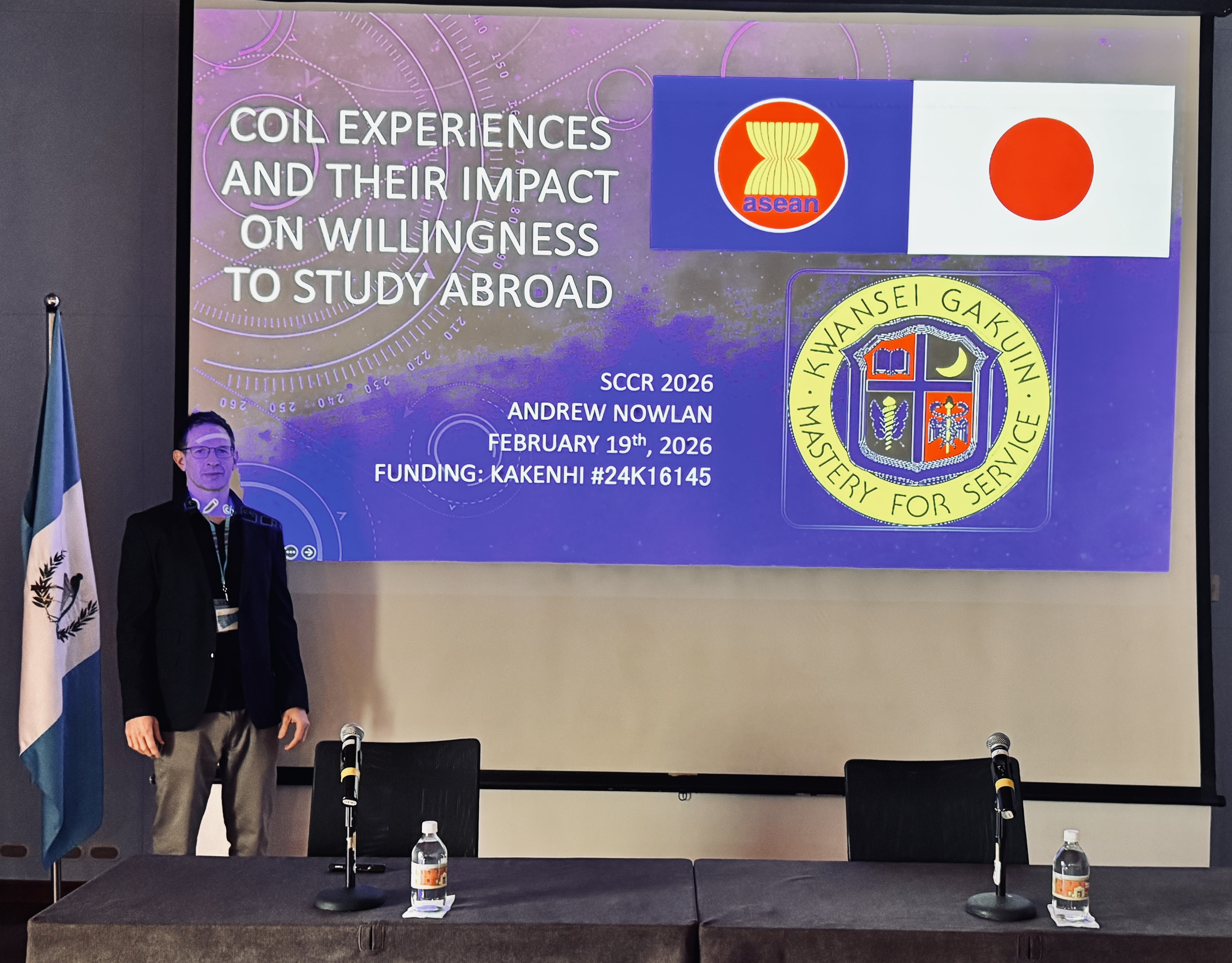 Andrew NOWLAN・言語教育研究センター言語特別准教授が、2026年2月18日から21日にかけ、Antigua, Guatemalaで開催されたSociety for Cross-Cultural Research 2026において、「COIL Experiences and Their Impact on Willingness to Study Abroad」をテーマに発表を行いました。Society for Cross-Cultural Research 2026は、異文化研究および文化間比較研究の発展を目的とした国際学会であり、世界各国の研究者が集い、理論的・実証的研究成果を共有し議論する場として開催されました。当該分野における最新の研究動向や実践的知見の交流を目的として実施され、約15カ国以上の国から約200名もの研究者が集まり、活発な発表・討議が行われました。会期中は多様な文化的背景を持つ研究者との意見交換が活発に行われ、先端的な研究成果が数多く紹介されました。自身の研究に対しても有益な示唆や建設的なフィードバックを得ることができ、今後の研究発展にとって大変意義深い機会となりました。