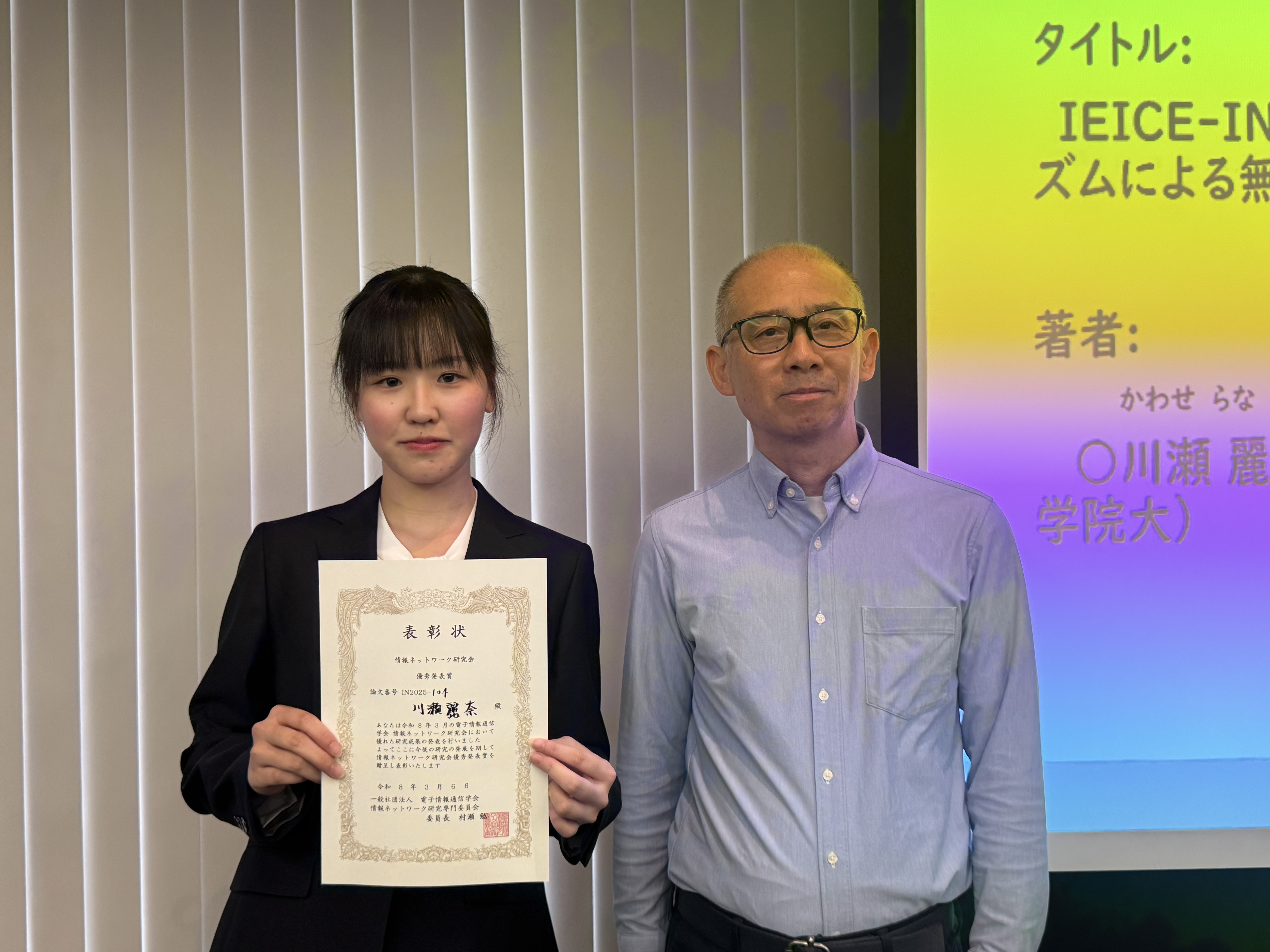 川瀬麗奈さん(工学部 情報工学課程3年生)らが電子情報通信学会 情報ネットワーク研究会「優秀発表賞」を受賞