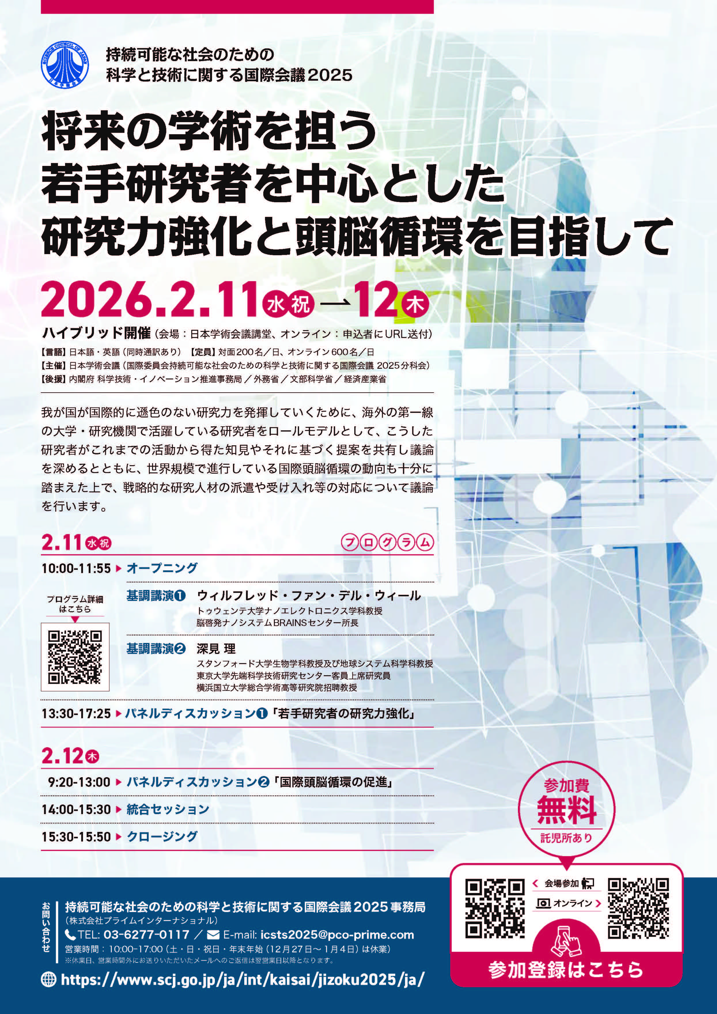 阪智香・商学部教授(日本学術会議連携会員)が、2026年2月11日から12日にかけて開催された、日本学術会議の国際会議「持続可能な社会のための科学と技術に関する国際会議2025『将来の学術を担う若手研究者を中心とした研究力強化と頭脳循環を目指して』」(於:日本学術会議講堂)において、『国際頭脳循環の促進』に関するパネル討論に登壇しました。
