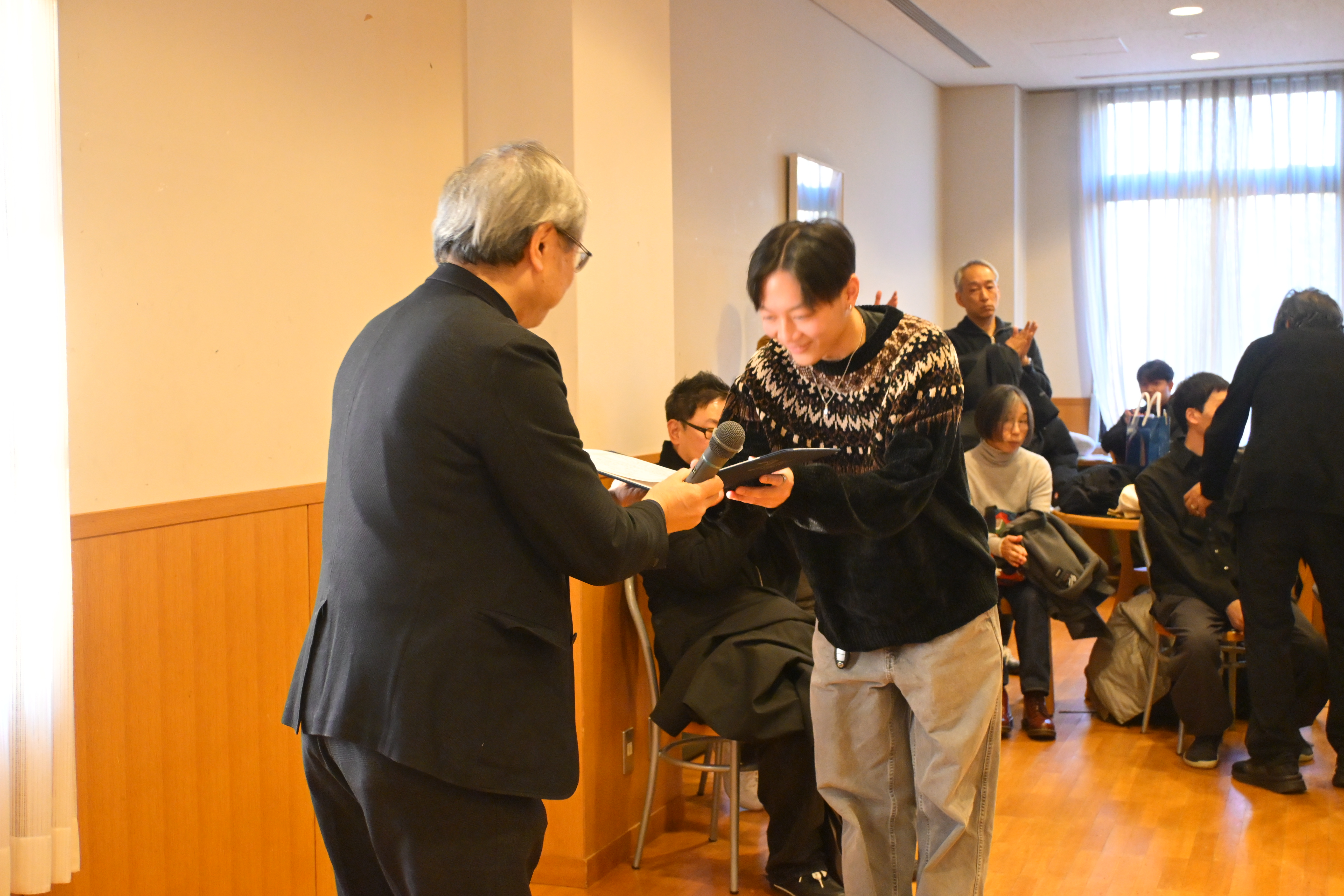 表彰式・懇親会は第二厚生棟2階にて行い、それぞれの担当教員や非常勤講師の先生方からフィードバックや卒業に向けての激励をいただきました。