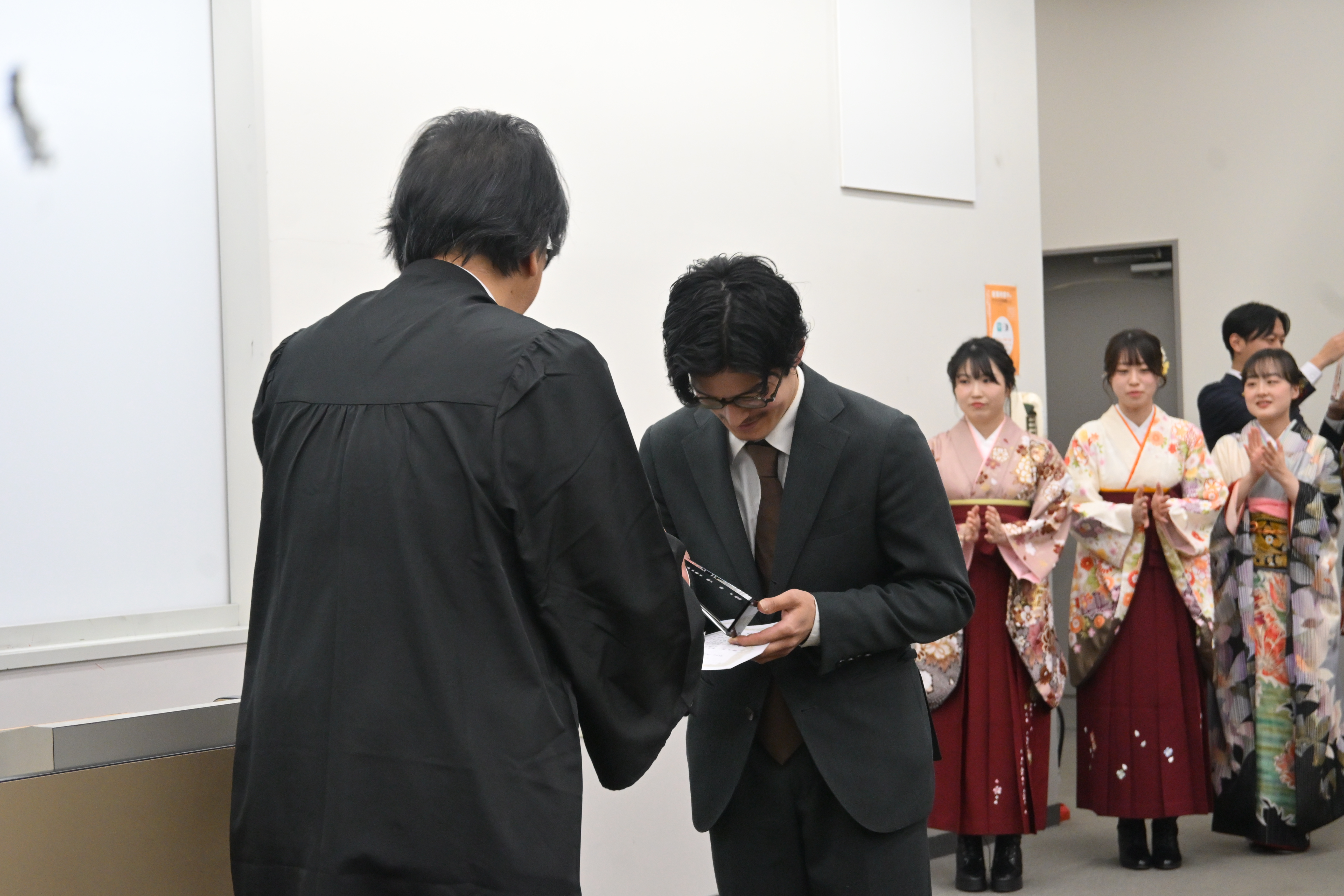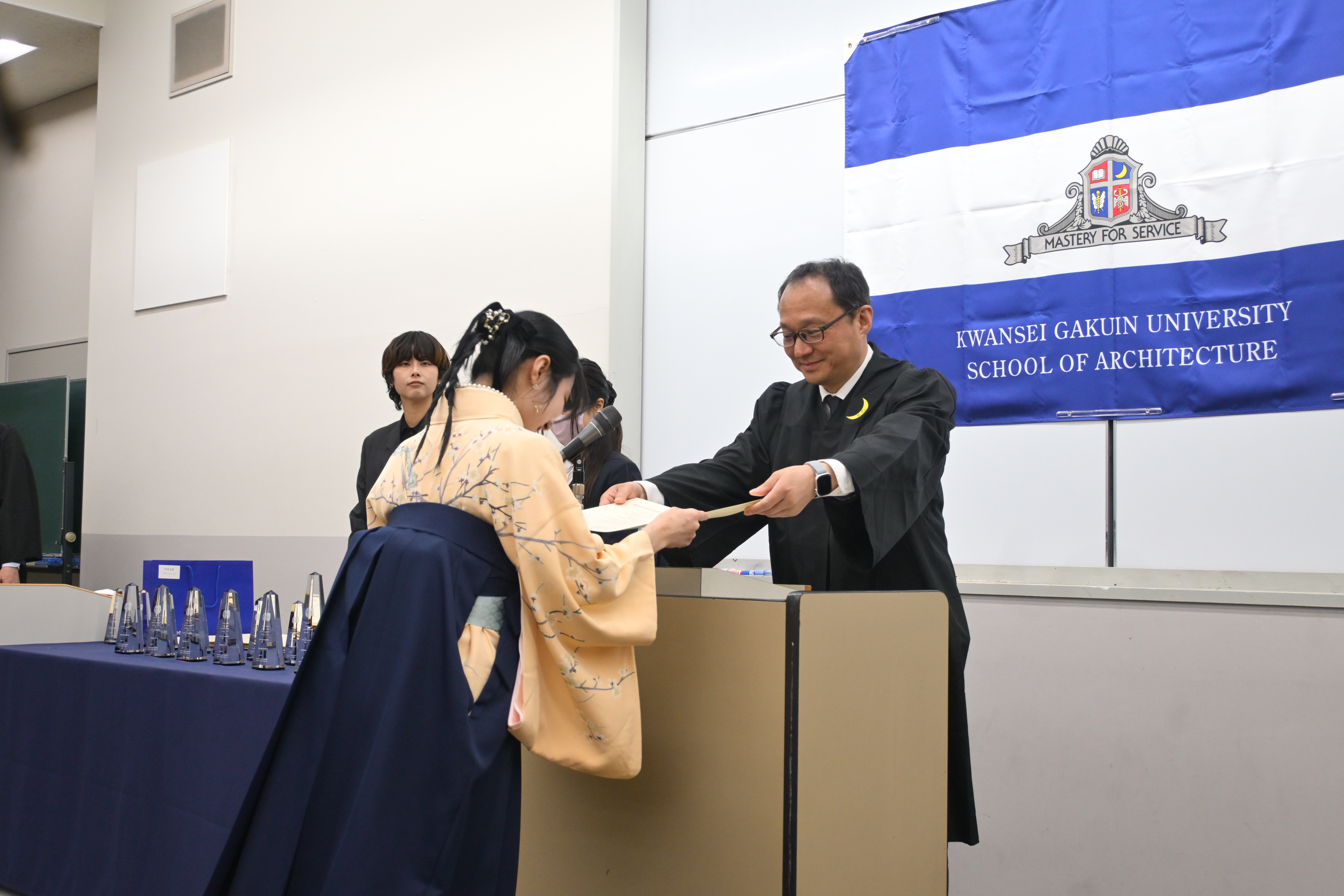 各研究室の教員から、一人ひとりに卒業証書が授与され、建築学部の学部旗を背に卒業生たちの晴れやかな笑顔があふれる心温まる一日となりました。