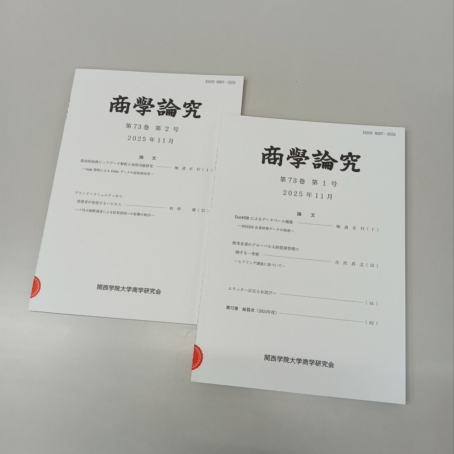 2025.11.20[ニュース] 『商學論究』第73巻 第1号、第2号 を発行 Share 『商學論究』第73巻 第1号、第2号 を発行しました。 論文タイトル・執筆者など詳細につきましては、以下の『商學論究』のページをご覧ください。 商學論究関連ページへのリンク Information一覧