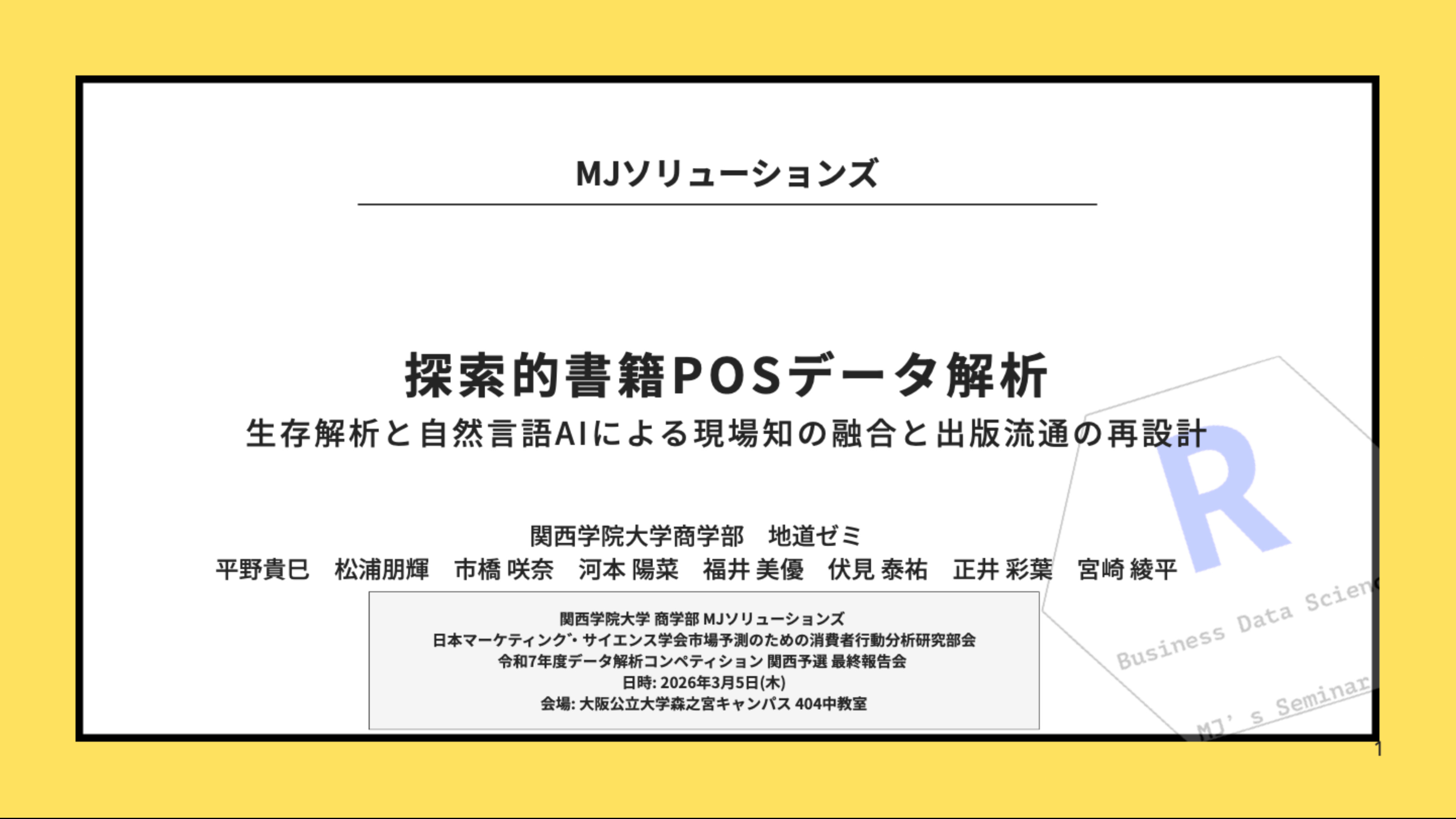 令和7年度(2025年度)は、関西予選の最終報告会が、2026年3月5日(木)に大阪公立大学森之宮キャンパスで開催されました。地道ゼミ9名のチーム「MJソリューションズ」が、「探索的書籍POSデータ解析—生存解析と自然言語AIによる現場知の融合と出版流通の再設計—」というタイトルで発表しました。