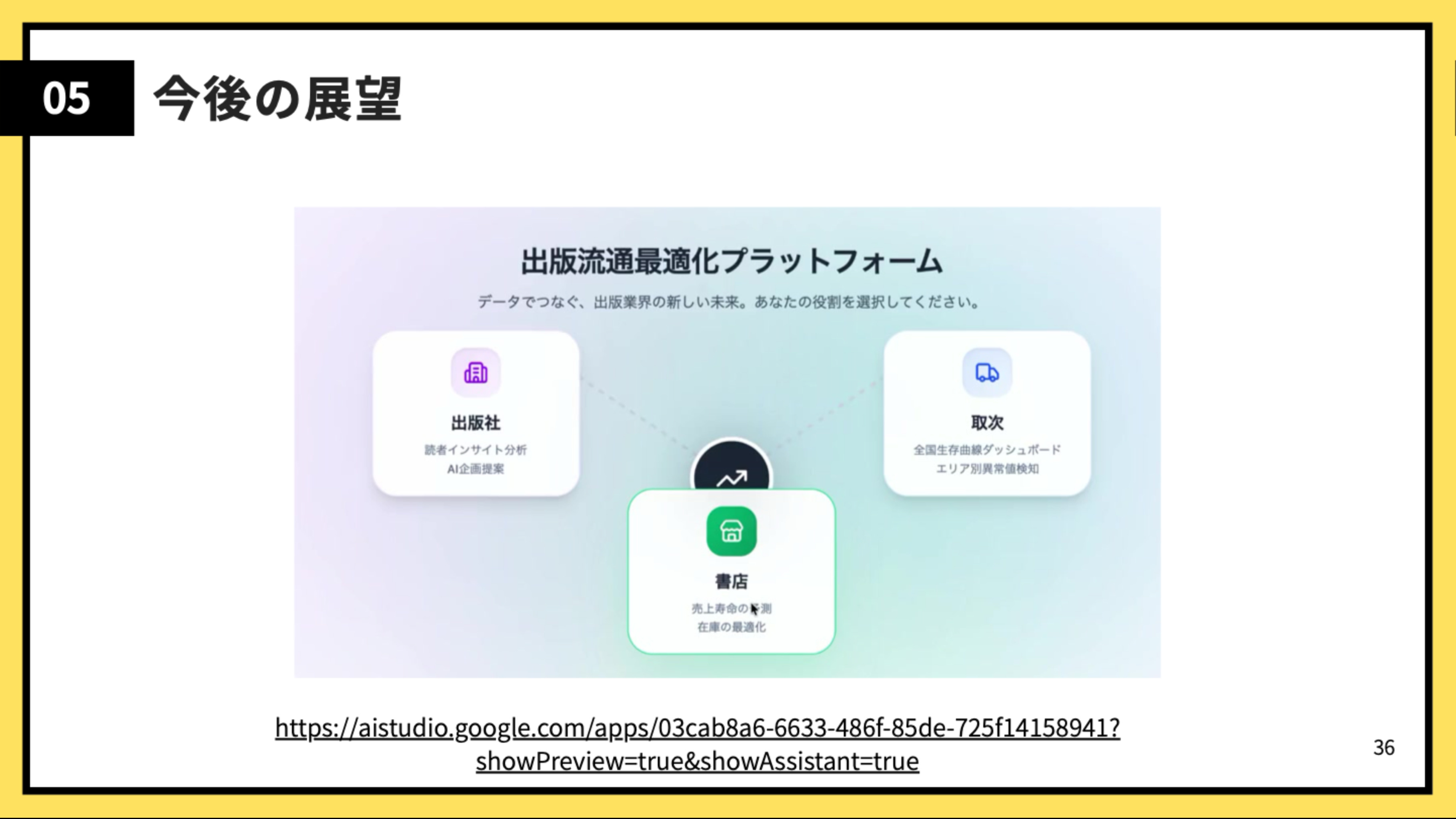 最終報告会では、現在書籍業界がもつ課題である「過剰な返品コスト」と「情報のサイロ化」という問題に対して、生存時間解析という統計手法を利用することによって、書籍の販売構造の違いを可視化と仮説検定によって検証し、その結果から「意思決定支援ツールの設計」と「三者横断データ基盤の構築」について提案しました。さらに、AI駆動によって「出版流通最適化プラットフォーム」のプロトタイプも構築しました。