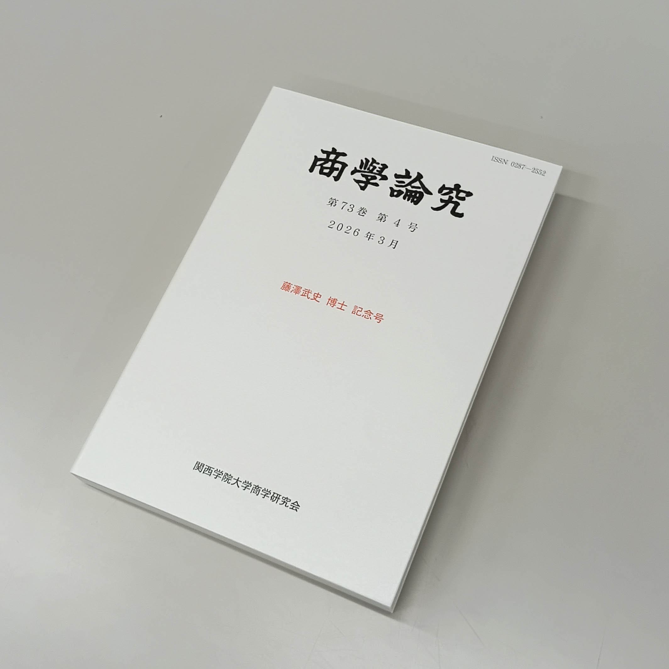 2026.03.15[ニュース] 『商學論究』第73巻 第4号 藤澤武史博士記念号を発行 Share 『商學論究』第73巻 第4号 藤澤武史博士記念号を発行しました。 論文タイトル・執筆者など詳細につきましては、以下の『商學論究』のページをご覧ください。 商學論究関連ページへのリンク Information一覧