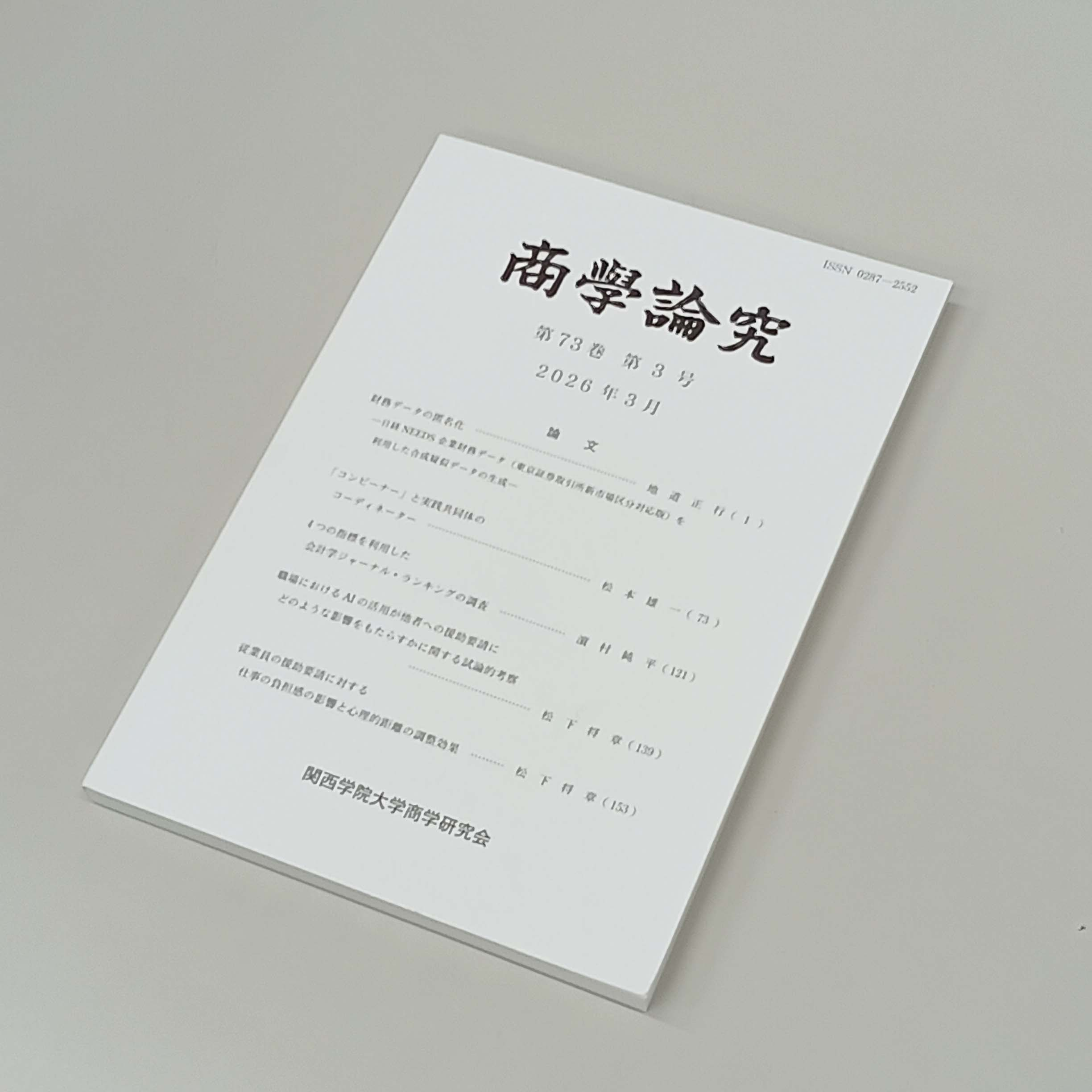 2026.03.15[ニュース] 『商學論究』第73巻 第3号 を発行 Share 『商學論究』第73巻 第3号 を発行しました。 論文タイトル・執筆者など詳細につきましては、以下の『商學論究』のページをご覧ください。 商學論究関連ページへのリンク Information一覧