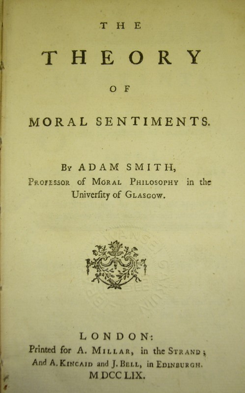 写真2は『道徳感情論 The Theory of Moral Sentiments 』のタイトルページである。当時の「道徳 Moral」とは社会を生きていく人間の行為の規則の全体(生きていくために必要な生産・交換も含めた人間の社会関係全般に関する規則)を意味したから、「道徳感情」の理論とは、現在で言う社会心理学の側面から、自分の利益の追求を出発点とする近代的個人がそれなりに(誰にも命令されずに)自己規制しながら他人との社会関係を作りうるかを説明した。中世の神学的な哲学では個人の「利己心」からは社会秩序はできないと言われてきたのに対して、それが可能であるとした。
