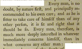 写真3は、人間の「利己心・自愛心」の正当性についての記述の抜粋である。上から2,3行目の“recommend to~”という表現は「~に託す、委ねる」という意味であり、現在の一部辞書では出てこないほどの古い表現である。ここでは、スミスの代表的な思想の1つである「自己利益の追求」について記されており、本書の重要ポイントといっても過言ではないだろう。
