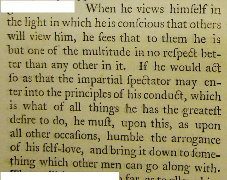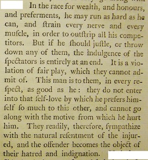 写真5は、端的にまとめると、自由競争がフェアプレーでなされるように、それを見ている複数の「観察者たちspectators」――他の箇所では単数で「公正な観察者 impartial spectator」――によるチェックが機能するという記述の抜粋である。ちなみに、公正な観察者(見物人)にどの程度まで許されるかという基準は、フェアプレーの侵犯を許さない近代的個人相互のやり取りの中で社会的な「良心conscience」として形成される(さらに「良心」は法・法律へ)。つまり、スミスの言う「道徳」は、既存の伝統的な道徳を前提としてはいないのである。