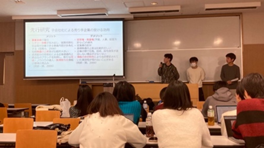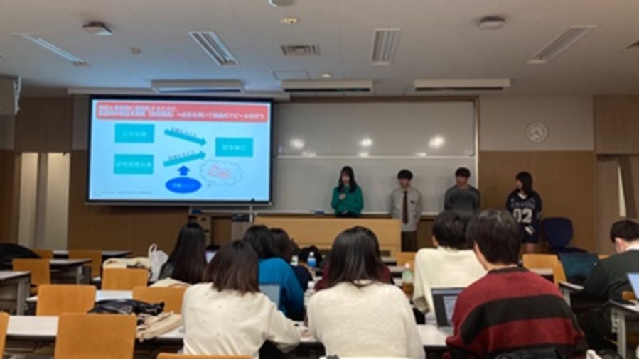 まず、20日午後、私たちは学習院大学へ向かいました。JR目白駅を出てすぐに校門が見え、都心にありながら落ち着いた雰囲気のキャンパスに新鮮さを感じました。合同ゼミ発表会では、学習院大学の和田ゼミ・西村ゼミ、そして関西学院大学の加藤ゼミから計8グループが参加し、各ゼミのゼミ長による挨拶から始まり、その後各グループからの発表が行われました。他大学との合同発表会は今回が初めてであり、他ゼミの発表や質疑応答を通じて、これまで自分たちが取り組んできた経済学分野にとどまらず、音楽や学力といった多様なテーマを扱う研究に触れることができ、新たな視点を得る貴重な機会となりました。