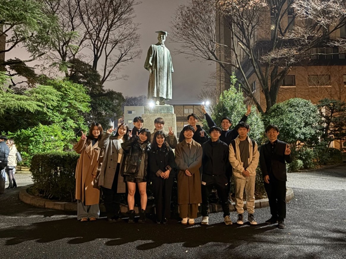 報告会はまるで高級ホテルのような建物の中で行われ、各教室では時間帯ごとに異なるグループが発表を行っており、参加者は自分の興味や関心に応じて自由に聴講することができました。各発表は研究テーマの設定や分析手法、プレゼンテーションの構成やデザインに至るまで完成度が高く、特に限られた時間の中で要点を的確に伝える発表技術や、鋭い質疑応答への対応には学ぶ点が多くありました。自分たちの研究を今後どのように深化させ、より説得力のある形で発信していくべきかについて、具体的な課題を認識することができました。最後に、キャンパス内の大隈重信像の前で記念写真を撮り、今回の遠征の締めくくりとしました。