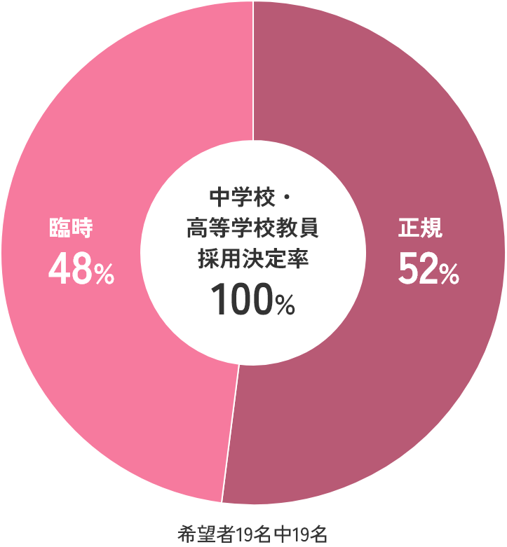 中学校・高等学校教員の希望者19名のうち、10名が正規採用、9名が臨時採用となり、採用決定率は100%となりました。