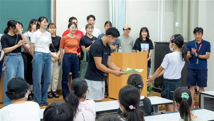 その後、初等教育学コース4年 泉谷尚輝さんから「今日は来てくれてありがとうございます。大きい声で挨拶をしてくれたり、1、2年生に歩くスピードを合わせてあげたり、良いところが一杯ありました。夏休み明けも元気な姿で会えることを楽しみにしています。」と児童に伝えました。