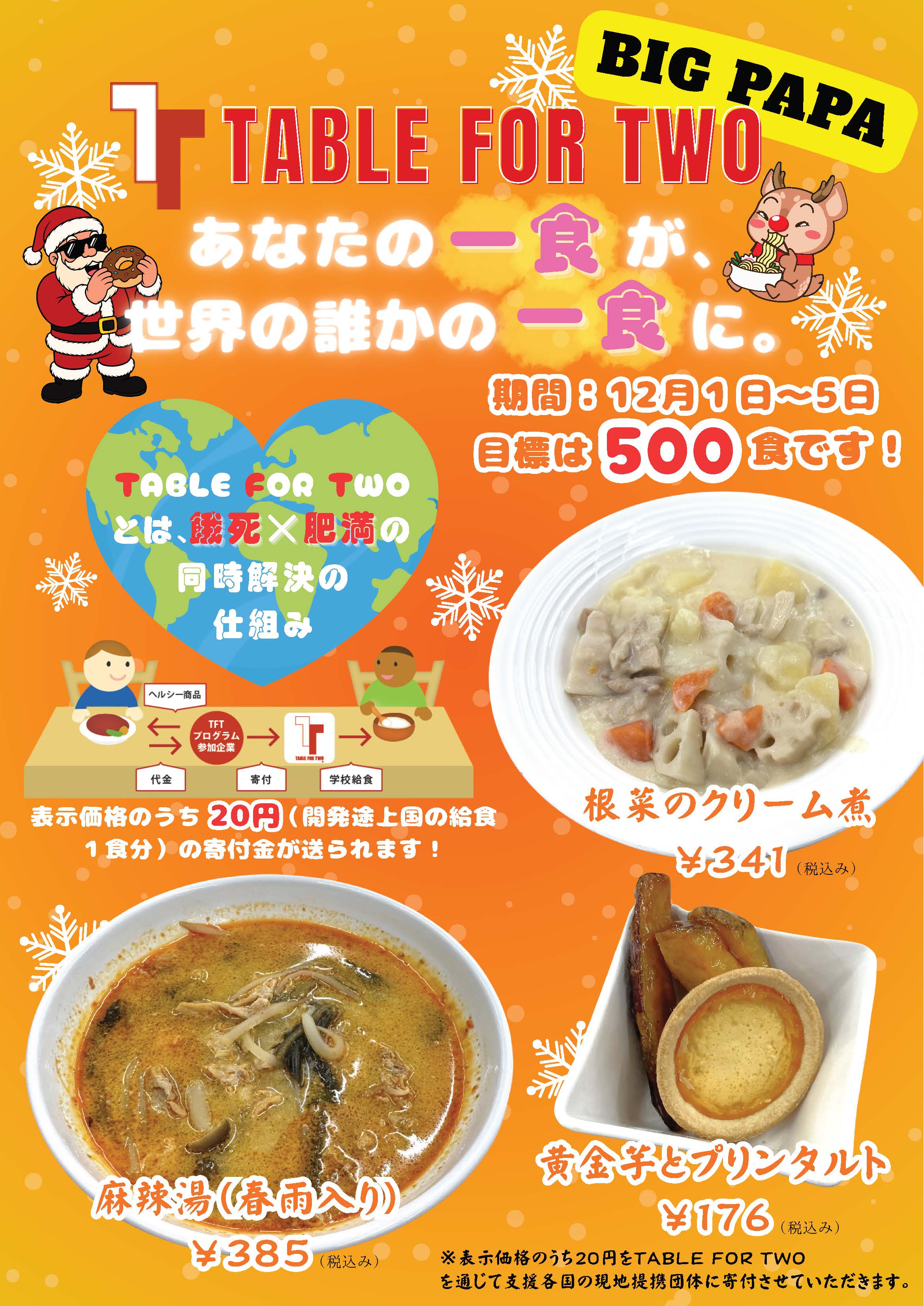 人間福祉学部で開講している「社会起業プラクティス」と関学生協とのコラボ企画「TABLE FOR TWO」を12月1日(月)~5日(金)の5日間、学生会館新館地下1階の食堂BIG PAPAで実施いたします。