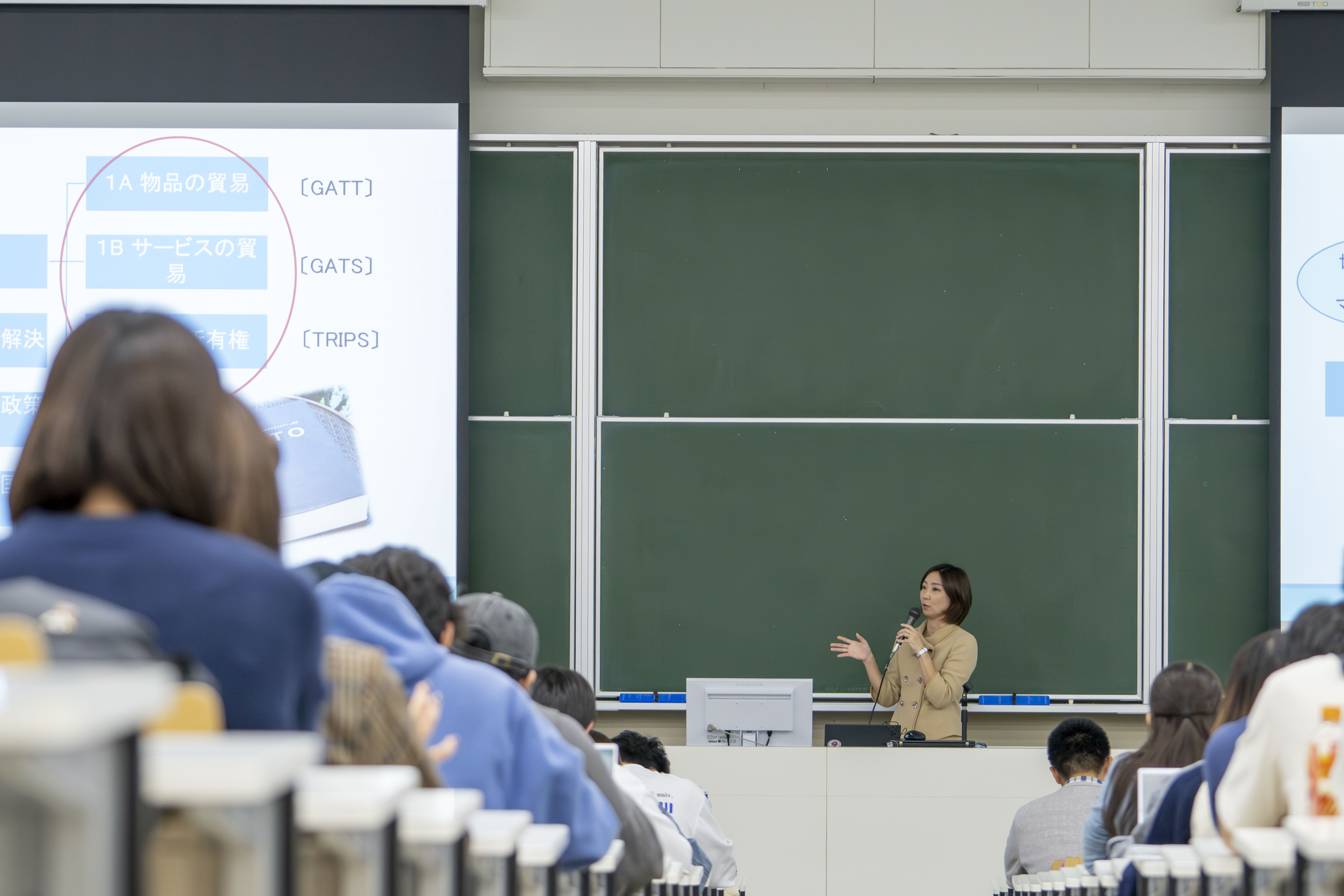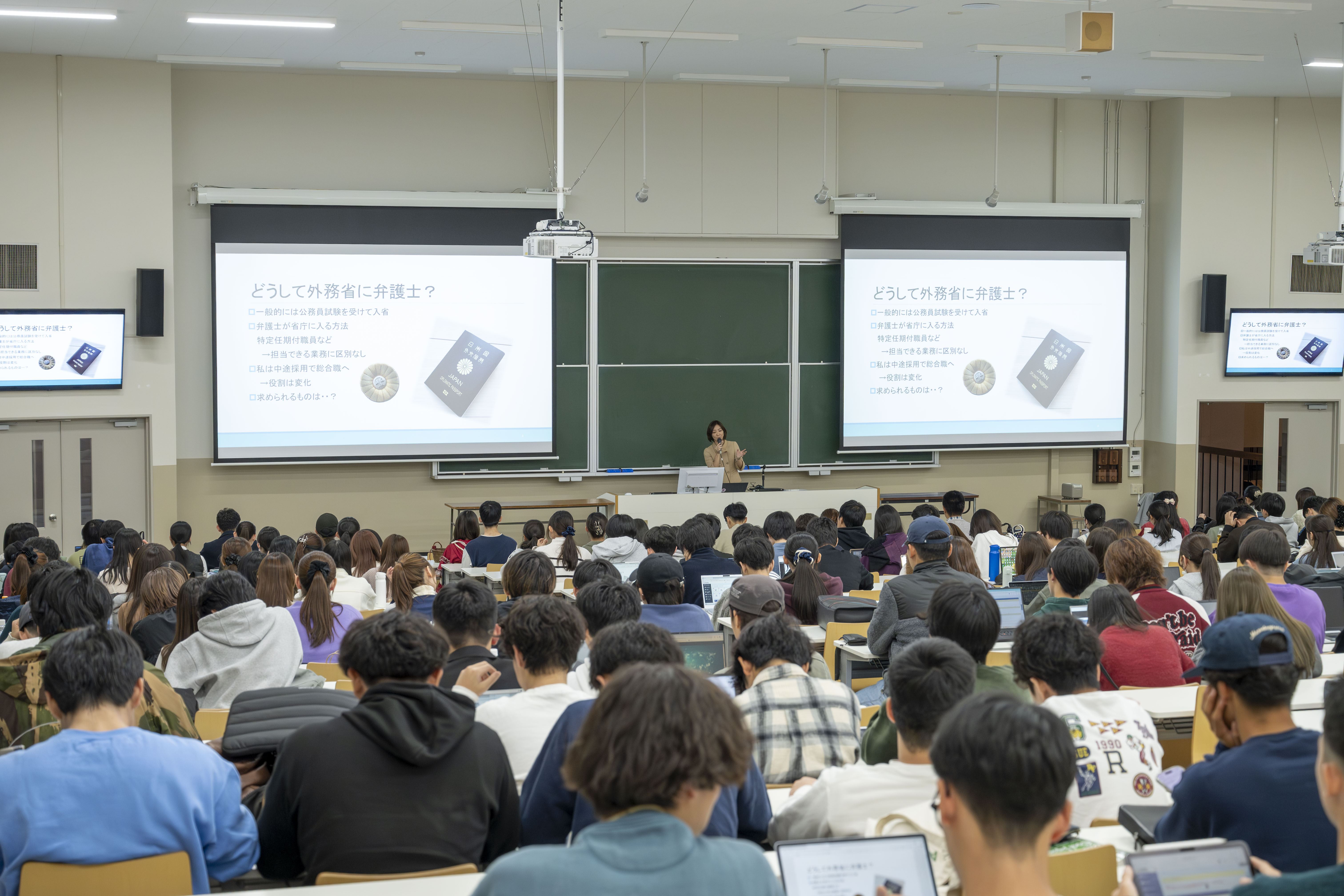 法学部が開講する「国際社会と法」が10月30日に西宮上ケ原キャンパスであり、外務省の新井理栄さん(経済局国際貿易課 課長補佐)が登壇しました。これは外務省が取り組む「外交講座」の一環で、外務省職員が全国各地の大学で講師として講義を行うものです。学生約350人が出席する盛況となりました。