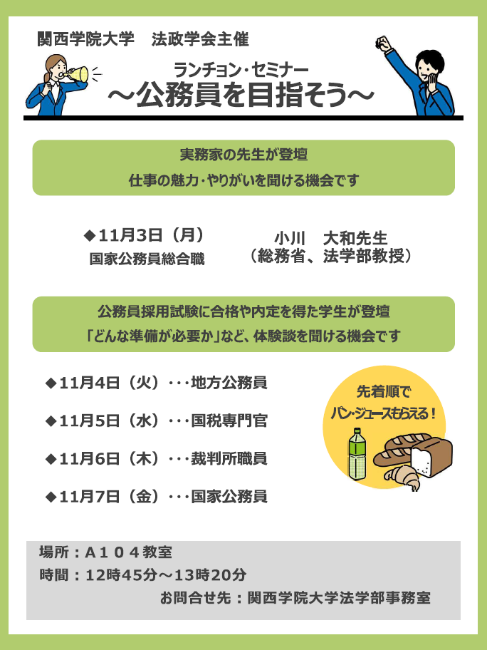 11月3日(月)~11月7日(金)、計5日間にわたり、公務員を目指す法学部生に向けたセミナーが開催されました。今回のイベント概要は以下のとおりです。