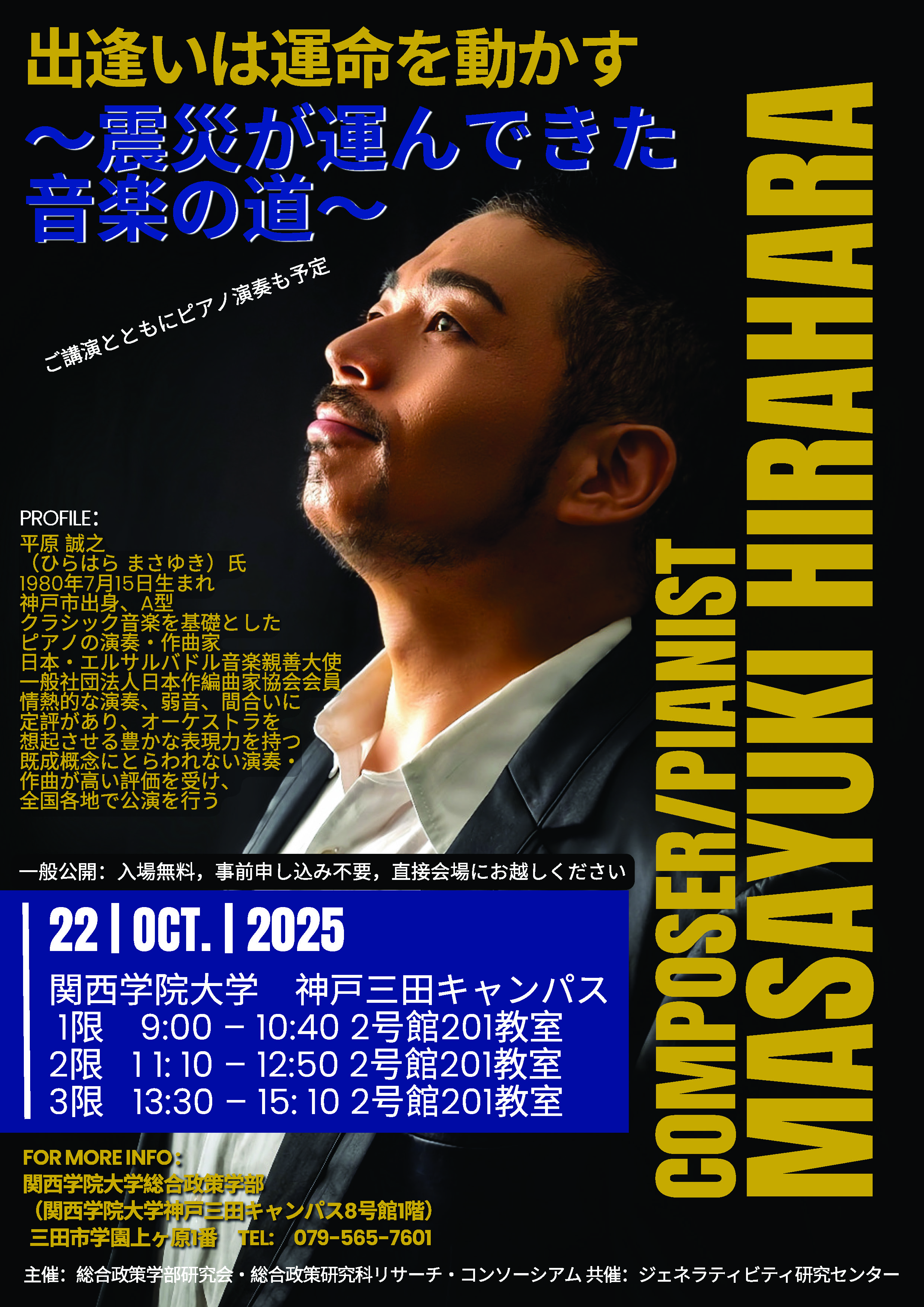 【10/22開催】学部講演会 出逢いは運命を動かす〜作曲家/ピアニスト 平原誠之 震災が運んできた音楽の道〜