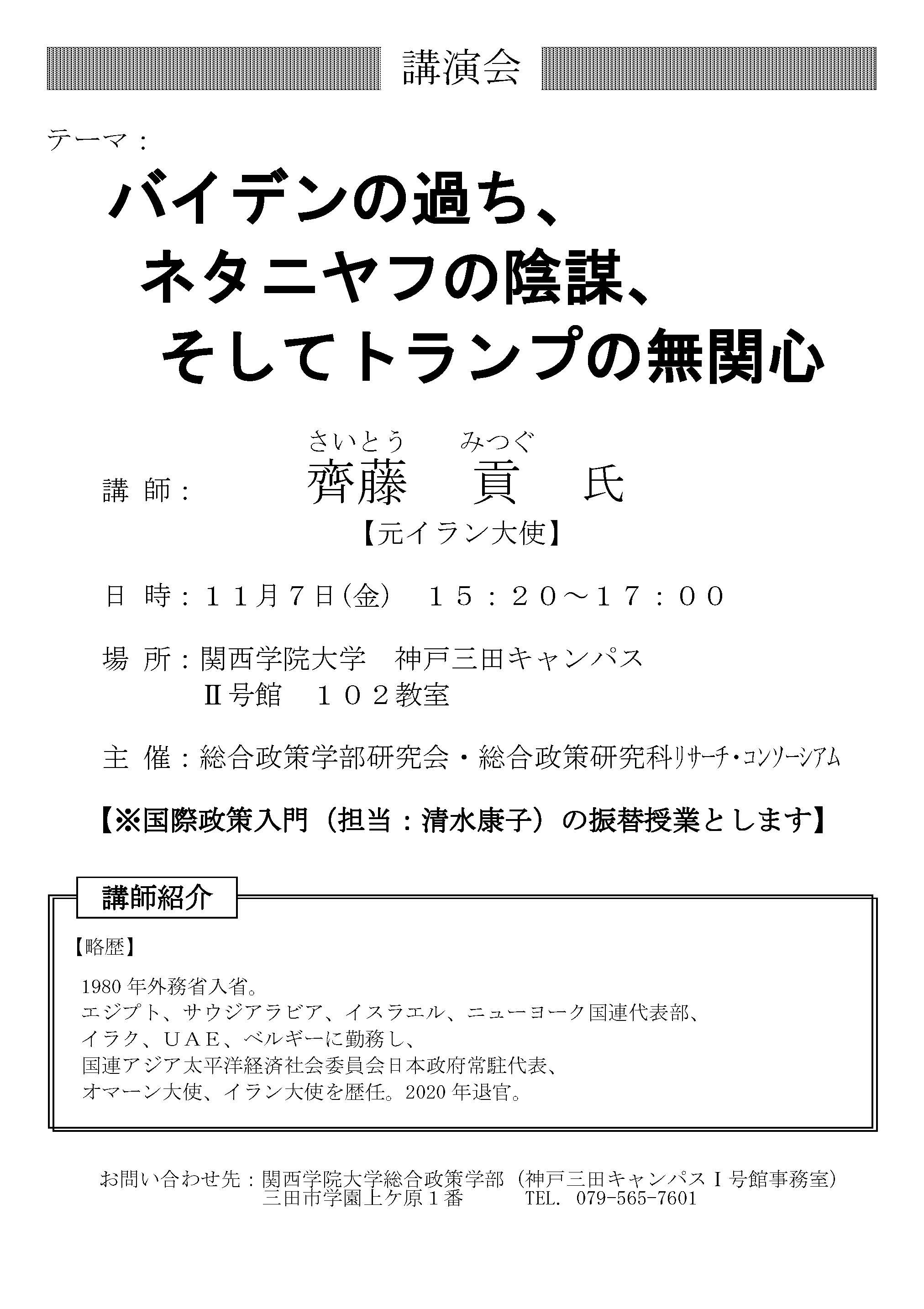 【11/7開催】学部講演会 バイデンの過ち、ネタニヤフの陰謀、そしてトランプの無関心