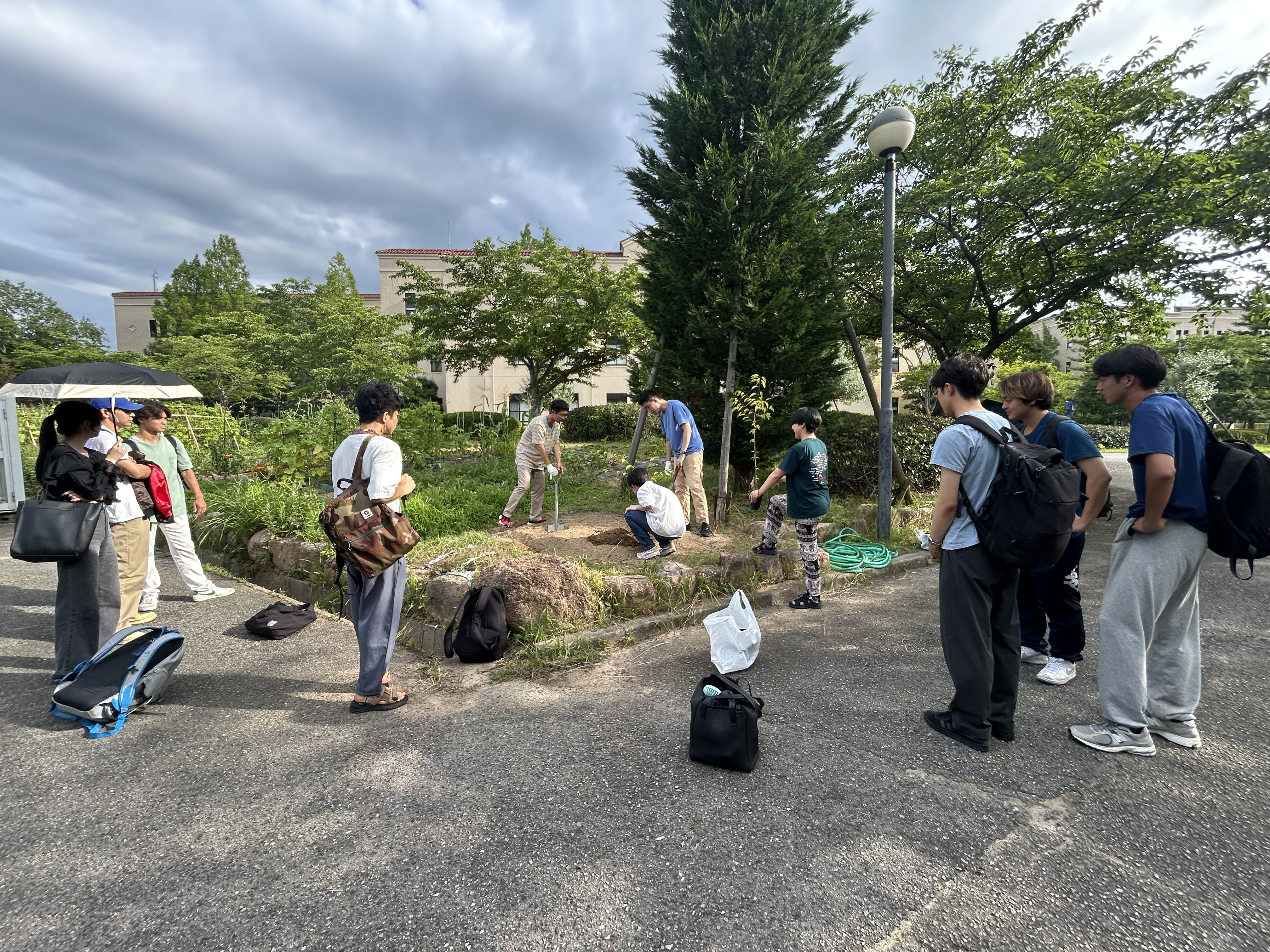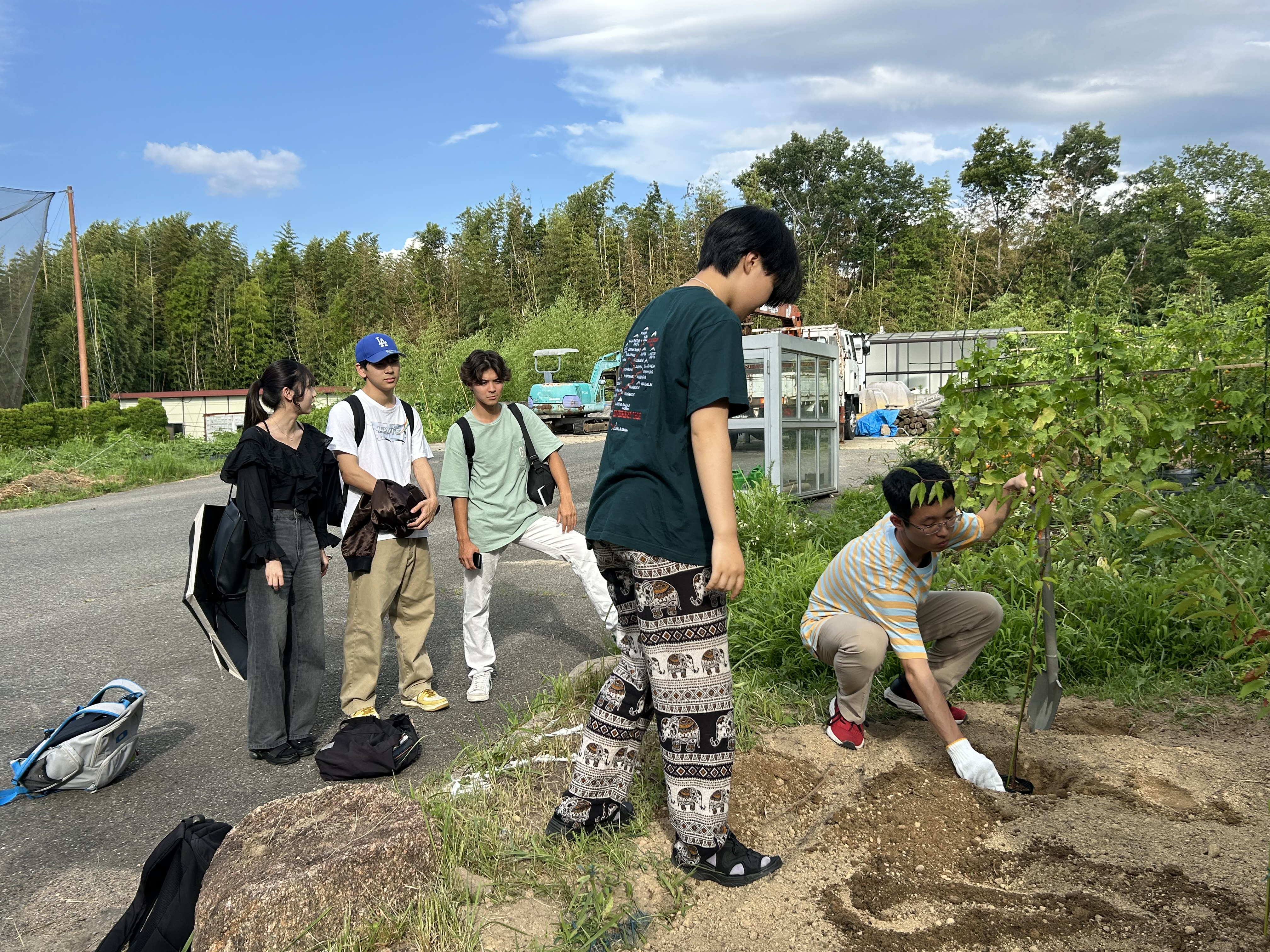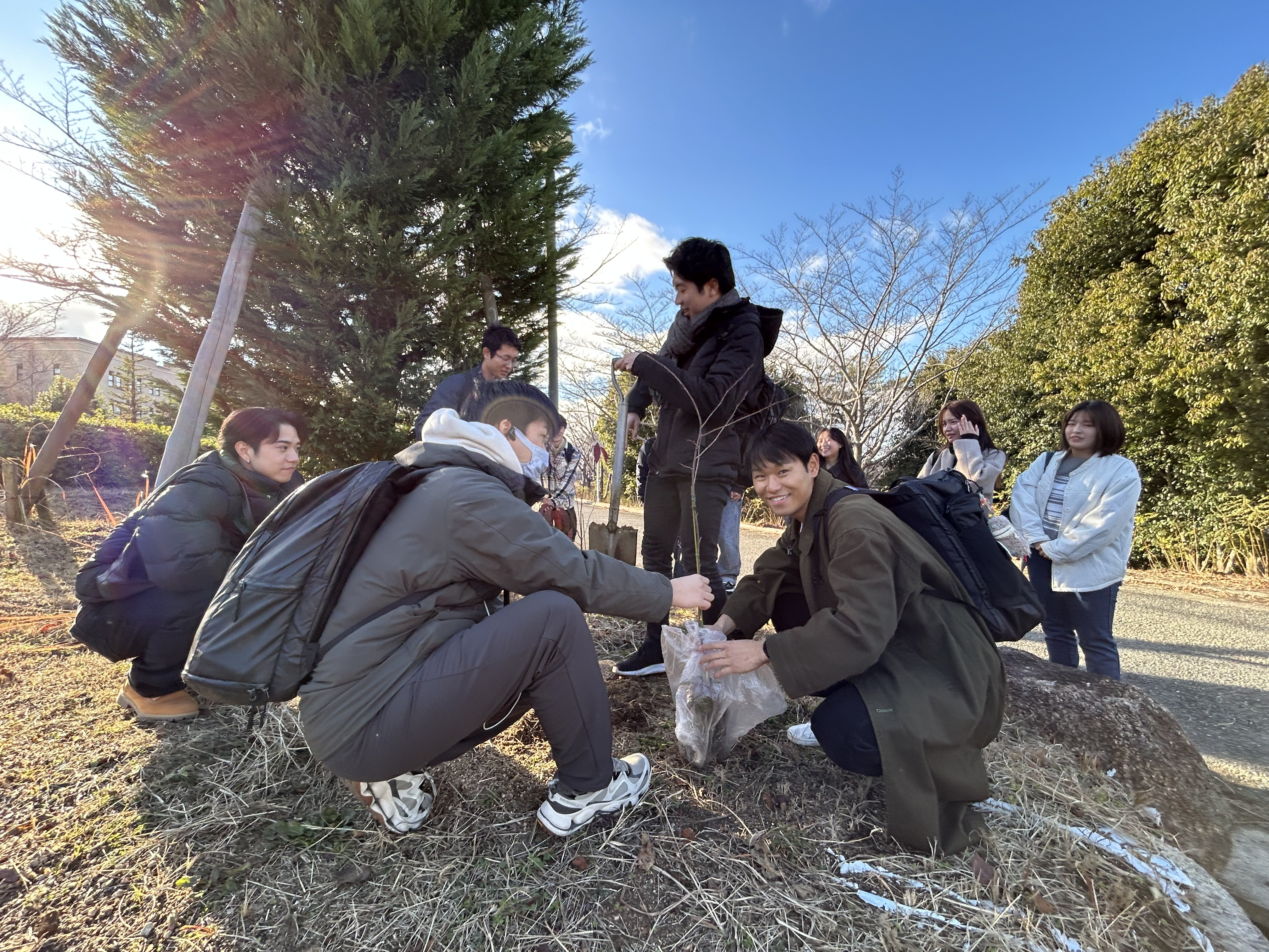 ゼミでは2025年初夏からこの取り組みに参加し、苗木をキャンパス内のエコファームで大切に育ててきました。猛暑が続く時期にも学生たちは水やりや草引きを欠かさず行い、その積み重ねによって今回の植樹が実現しました。