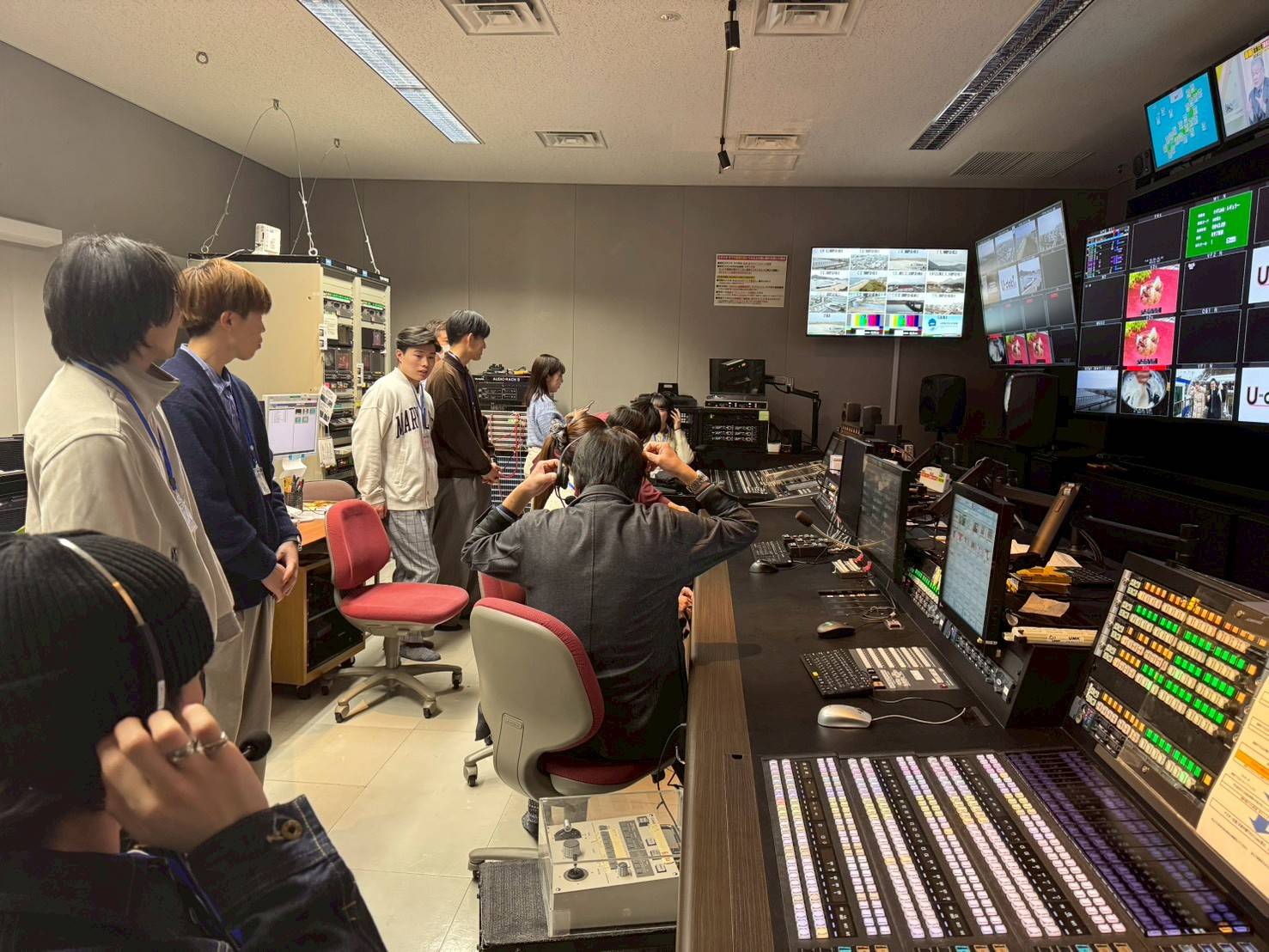 1日目は、テレビ宮崎(UMK)を訪問し、関学のOBである佐々木六華アナウンサーに案内していただきました。見学では、中継、放送がどのような流れで行われているのかを学びました。さらに、セットや機材の説明もしていただき、番組が制作されている現場の臨場感を体感することができました。普段、なにげなく見ているテレビ番組は、多くの人が関わって制作されているということを実感でき、とても貴重な経験でした。