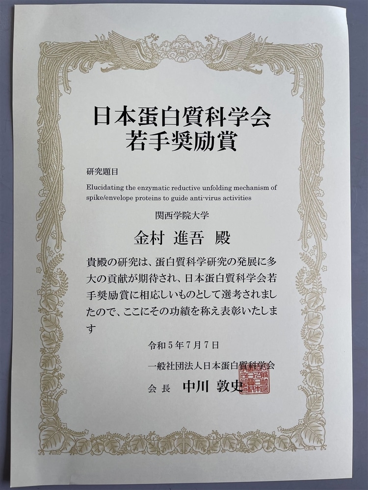金村助教が7月7日に開催された第23回日本蛋白質科学会年会において若手奨励賞を受賞し、受賞講演(英語)を行いました。受賞タイトルは、「Elucidating the enzymatic reductive unfolding mechanism of spike/envelope proteins to guide anti-virus activities」です。