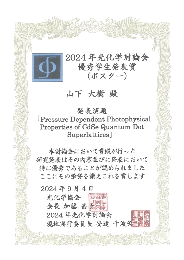 2024.10.08[化学科] 山下さん(玉井研M2)が優秀学生発表賞受賞 Share 2024年光化学討論会(9月3〜5日,九州大学)において玉井研M2 山下大樹 君が優秀学生発表賞(ポスター)を受賞しました。 Information一覧