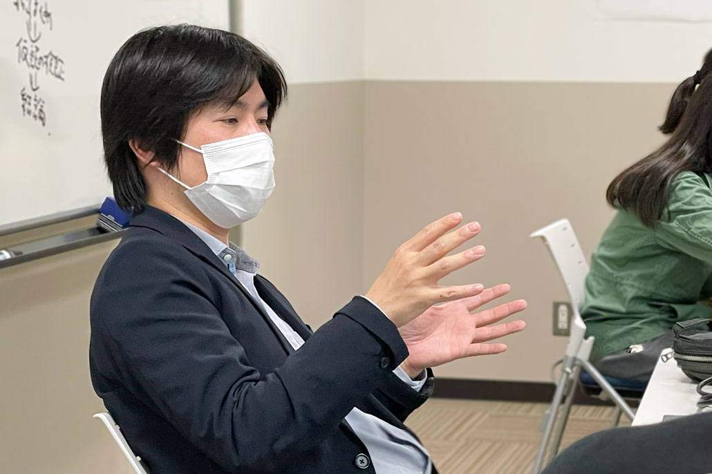 関係性の濃度としては、少ない人数でどれだけ時間を共有しているか、というのが影響していると思います。例えば、高校生はクラスがあって、「同じクラスの子」は、それだけで他のクラスの子よりも親近感を覚えます。もちろん、自分たち「関学生」っていう大きい集団にも(所属意識を)持てるけど、クラスっていう社会的アイデンティティ※1を持っていると、その中のメンバーに対して愛着を覚えますよね。所属する規模が小さければ、規模が大きいところと比べて、比較的人に対しての愛着は大きくなりますね。(愛着でいうと)時間もそうで、高校はずっと教室で一緒だけど、大学での基礎演習※2は、結局は授業時間の毎週100分だけです。高校のクラスと比べて基礎演習には、所属意識をあまり持たないですよね。今だけの関係性っていう感じが強くて。そういう同じメンバーとどれだけ一緒にいるのかが(関係性について感じる濃度の違いとして)大きいかなと思います。テーマは部活とサークルだったと思いますけども、そういう同じメンバーでどれだけ一緒にいるかが大きいかなと思いますけど。