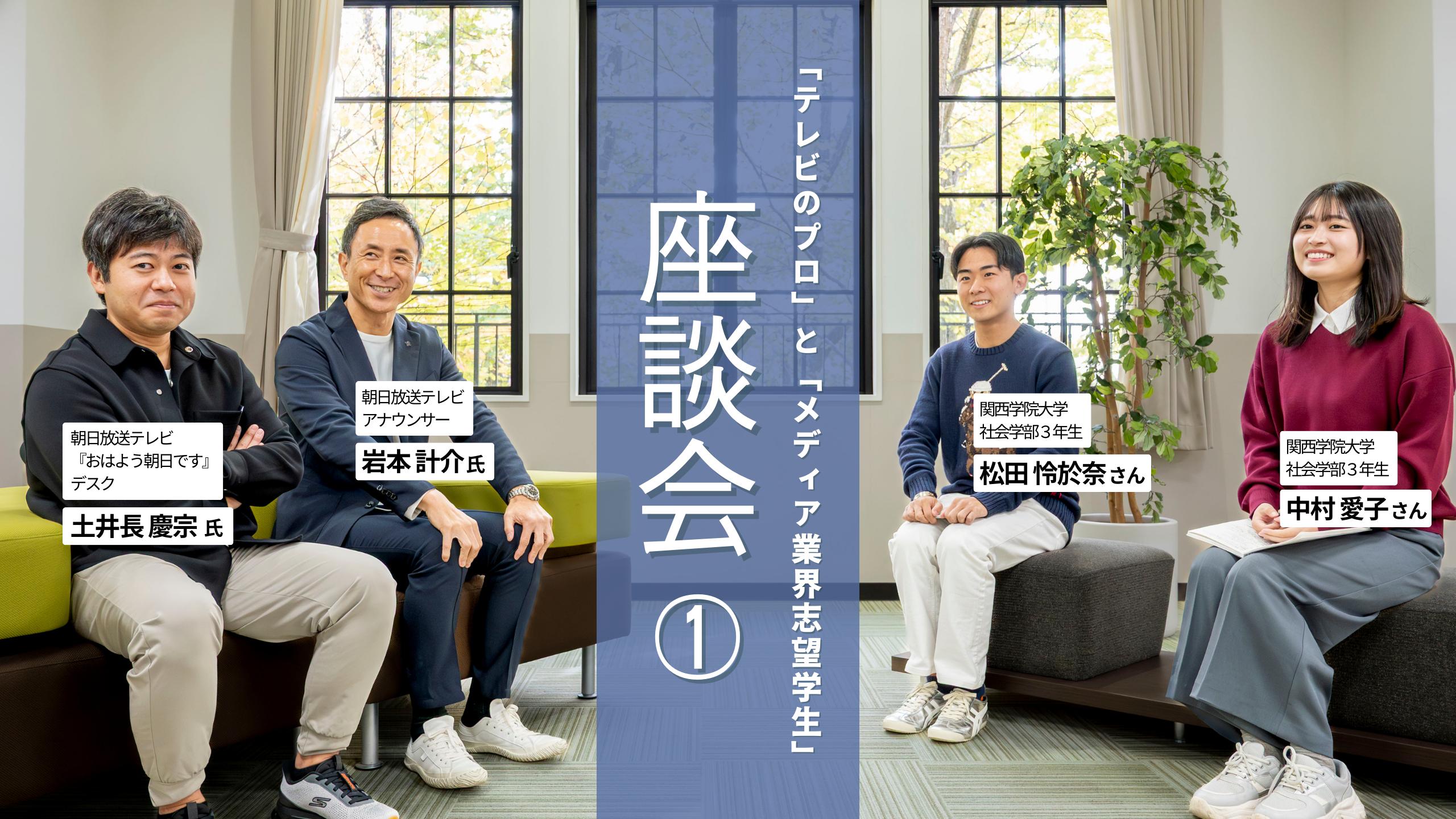 11月4日、「社会学部の学びは、メディア業界でどう活きるのか?」をテーマに、朝日放送テレビ『おはよう朝日です』の岩本計介アナウンサーと土井長デスク、そしてメディア業界を目指す社会学部3年生による座談会を開催しました。