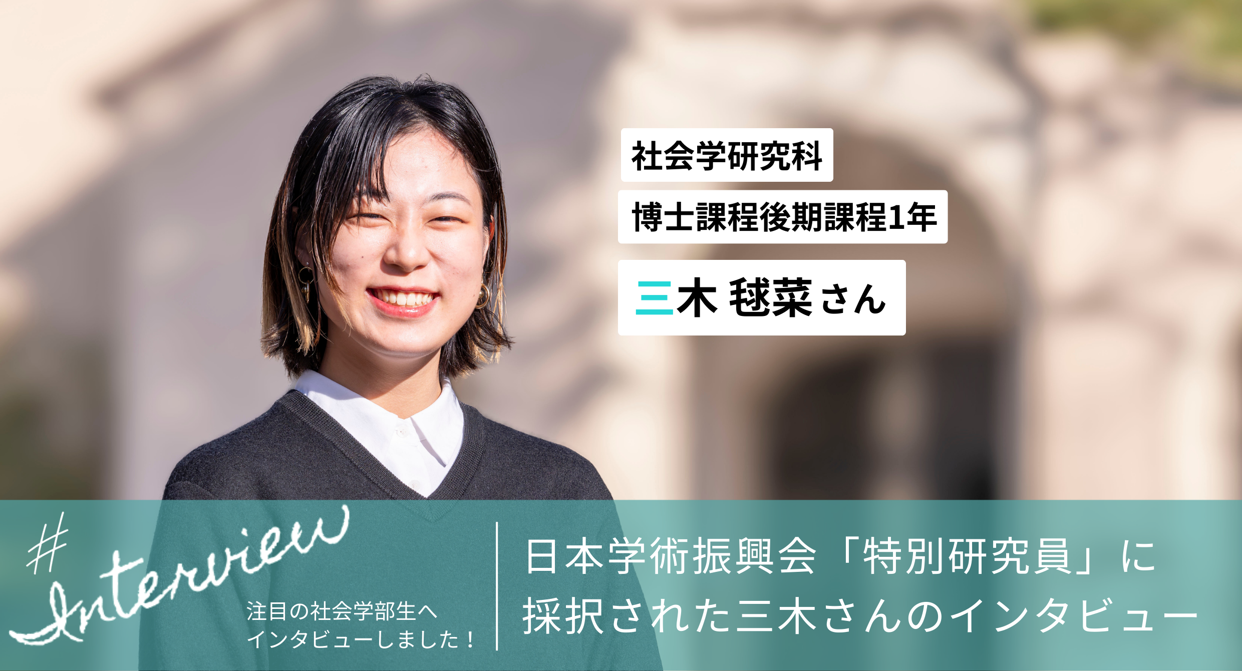 インタビューでは、日本学術振興会「特別研究員」に採択された三木さんに、研究テーマや研究に向き合う姿勢、社会学の学びの魅力についてさまざまなお話を伺いました。