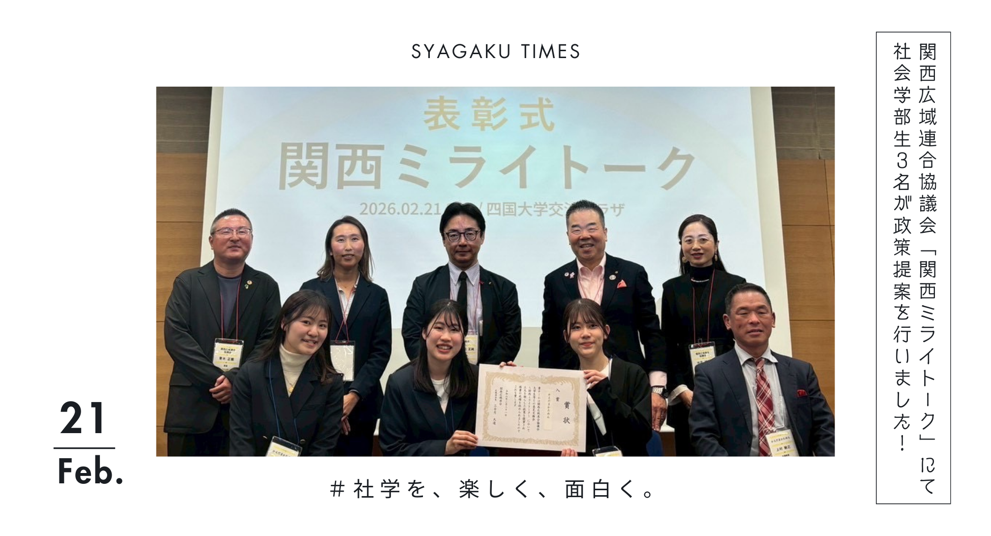 2月21日(土)、社会学部の3年生3名が四国大学交流プラザ(徳島市)で開催された「令和7年度 関西広域連合協議会 大学生等との意見交換会~関西ミライトーク~」にて、政策提案を行いました。