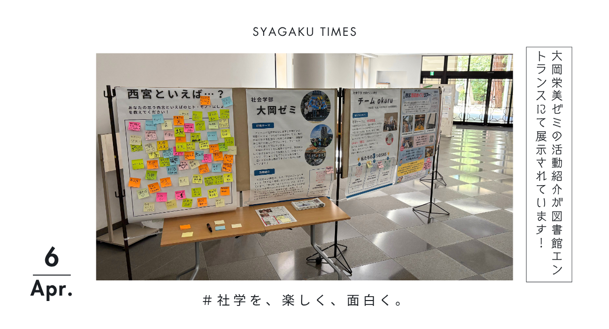 2026.04.16[ニュース] 社会学部・社会学研究科公式noteに大岡栄美ゼミの活動に関する記事を投稿しました! Share 社会学部・社会学研究科公式noteに入学宣誓式の記事を投稿しました! ぜひご覧ください。大岡栄美ゼミの活動紹介が図書館エントランスにて展示されています!|関西学院大学社会学部・社会学研究科 Information一覧